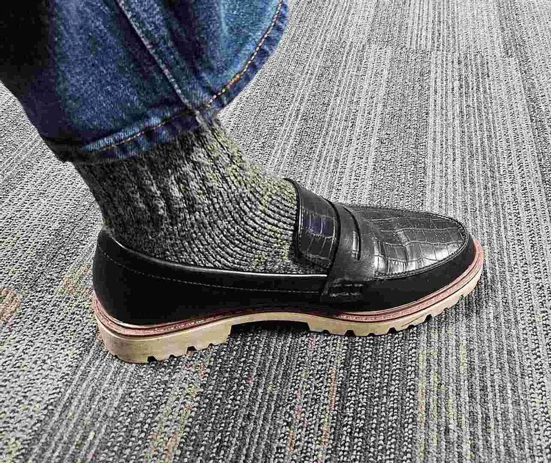 Cushioned, comfortable, and I love the lug sole, very stable and non-slip and gives my back great support. I'm wearing a size 10 with thick winter socks in the picture and the fit is true to size. . . no smooshed toes. The cream colored soles are nice looking, but get dirty so you'll need to keep an eye on that. Otherwise, I highly recommend these shoes.
