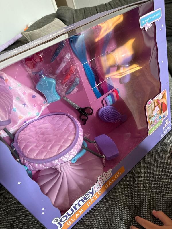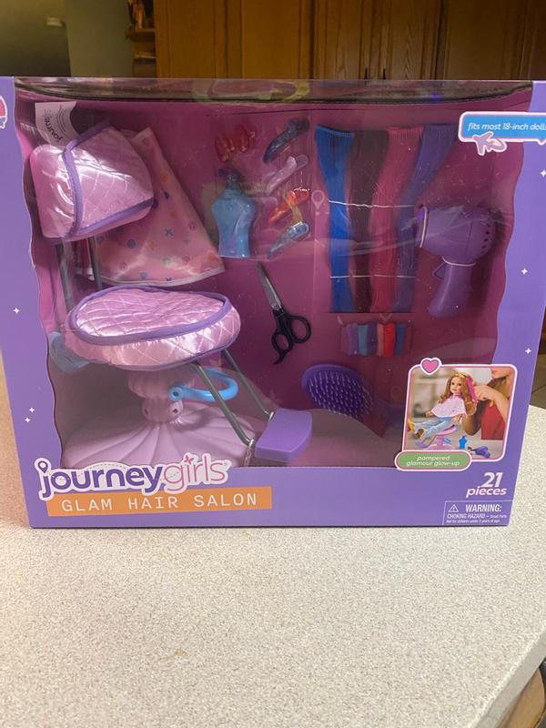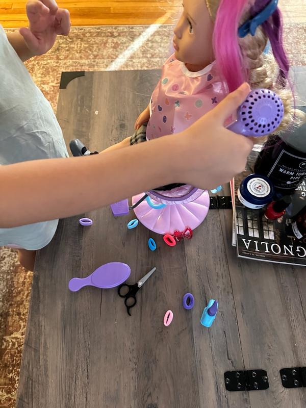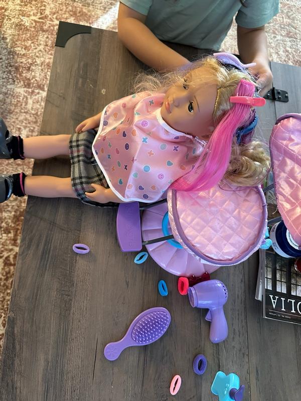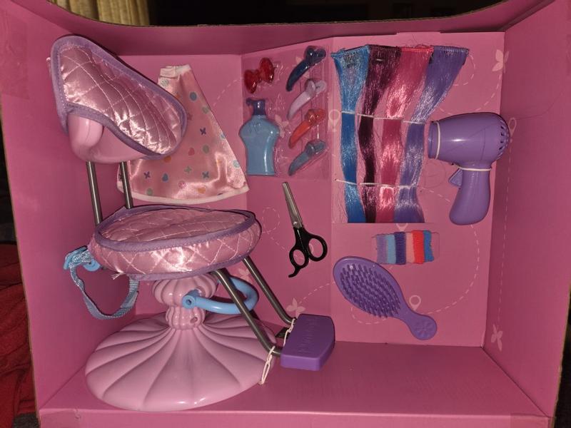 Such a cute setup to be able to play with your 18 inch dolls! It comes with a hair chair, a cape and hair extensions and accessories. We spent hours playing hair with her dolls! This is one great set to buy if you have a little girl that loves dolls!