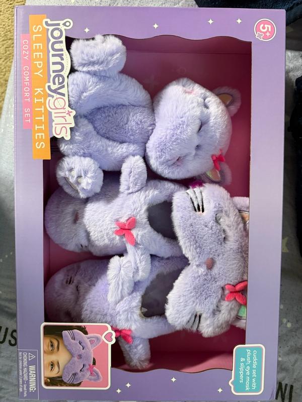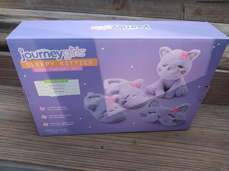 This Girls' Eye Mask and Slipper Set featuring a plush cat from the Girls' Journey collection is absolutely amazing! My daughter loves it so much. The materials are great, the slippers fit perfectly, and the plush cat is very soft. The eye mask is comfortable to wear as well. Overall, this is a fantastic gift set!