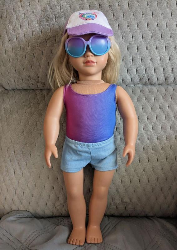 Super cute outfit. Thick, bright material, very realistic. Fits most 18 inch dolls. The hat has a real brim so it actually stays on the dolls head. The glasses too