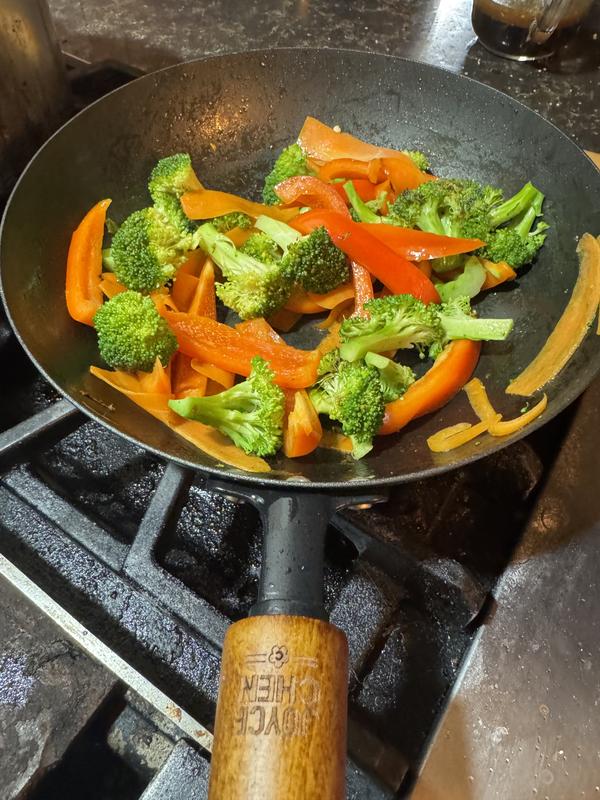 I really enjoy using this pan for stir frying my veggies and sometimes meat or fish. It heats evenly and is so easy to clean. I also like the wooden handle. Very comfortable to use. This has made a great addition to my cookware as i didn't have a pan especially for stir fry and just used a regular frying pan.