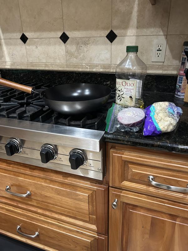 This stir fry pan is much thicker and stronger than I expected. I love the wood handle and the depth of this pan . I’ve been handwashing with soap and hot water and it’s been quick clean up. Getting a smaller version would probably be great.