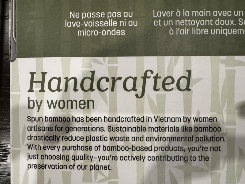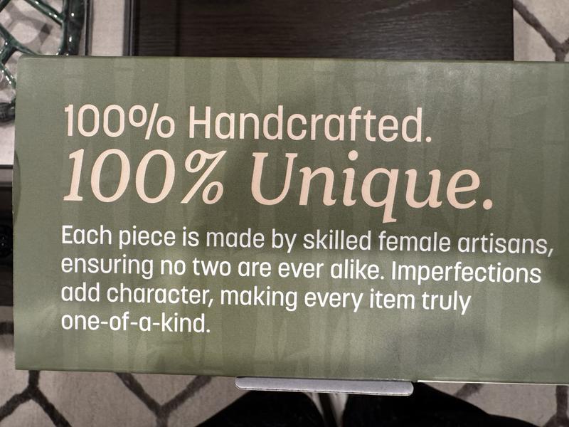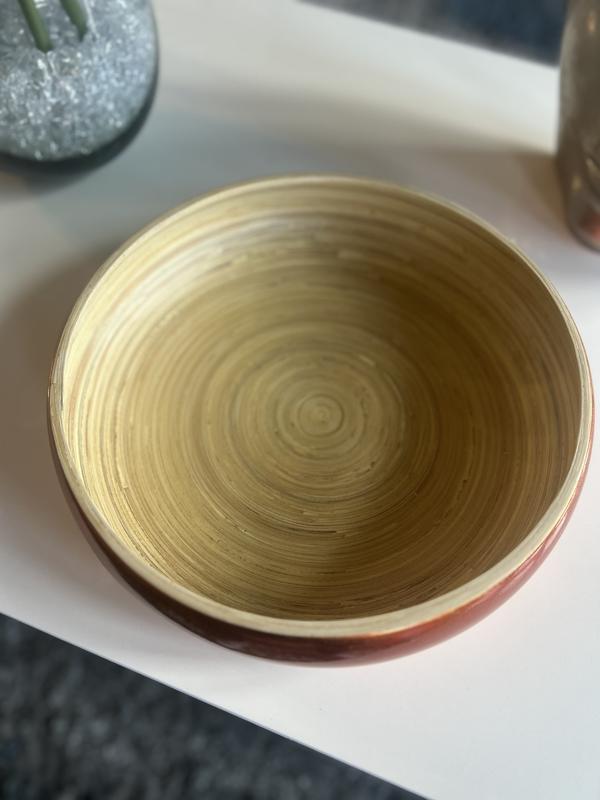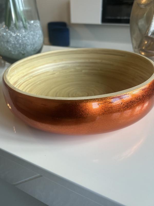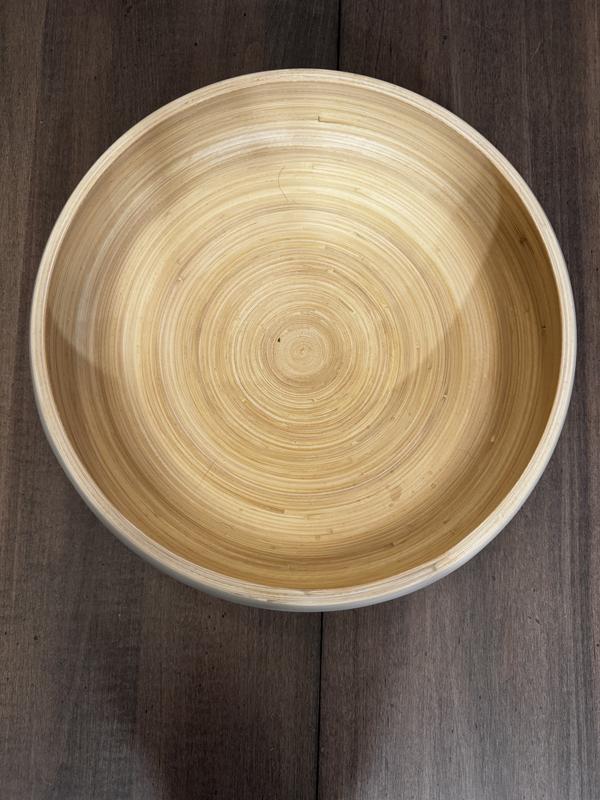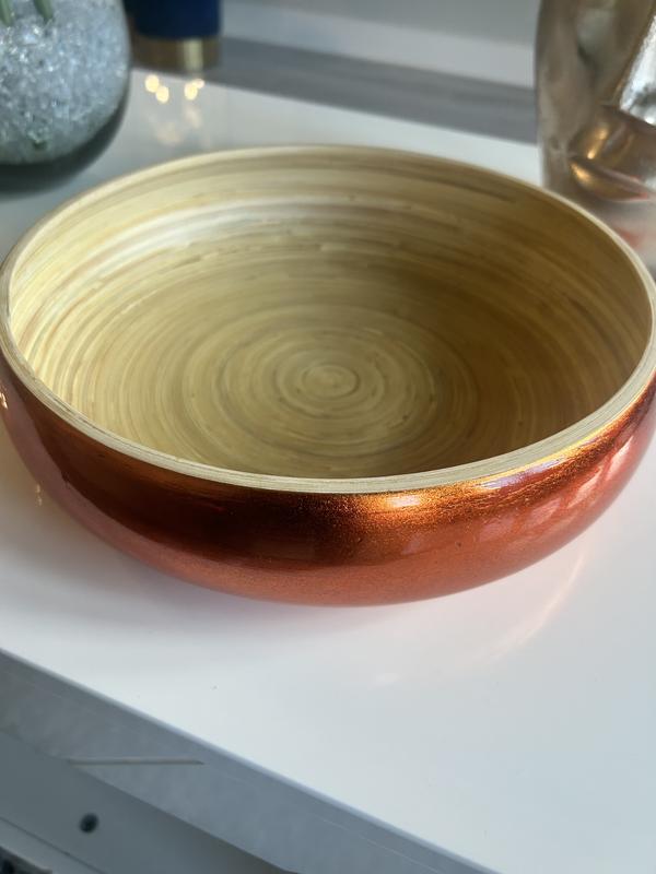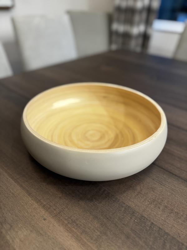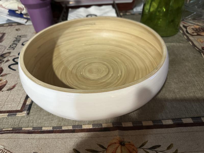 This is probably one my my favorite decorative accessories. It is so elegant and provides a lovely accent for my dining table. The gray finish is the perfect shade for my color scheme. I'm not sure I'll ever put fruit in it as that would cover the gorgeous pattern of the wood inside. The thing I love the most is these bamboo bowls are handmade by women in Vietnam. They are produced in a sustainable manner and are one of a kind. You will not be dissapointed!