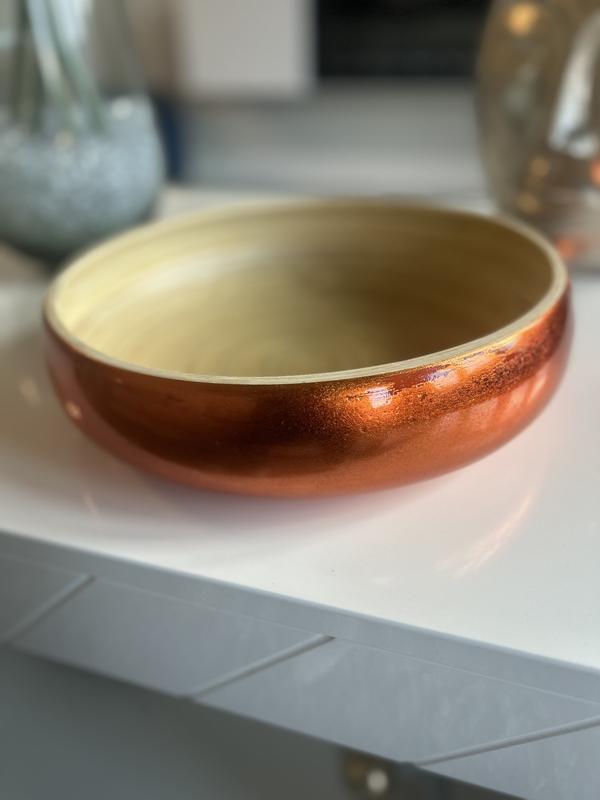 This fruit bowl is beautiful. I usually don’t do a fruit bowl on my counter but now having this bowl makes me want to keep some fruit out all the time. The copper color is very bold and has an amazing shine to it. It definitely brings some glow to kitchen or dining room, wherever you choose to put it. It is thick but very light weight. Makes a great gift.