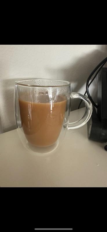 This is a great double wall glass mug! The double layer ensures it’s not hot to the touch and the packing with two glasses is nice. The mug is lightweight but seems durable in the dishwasher.