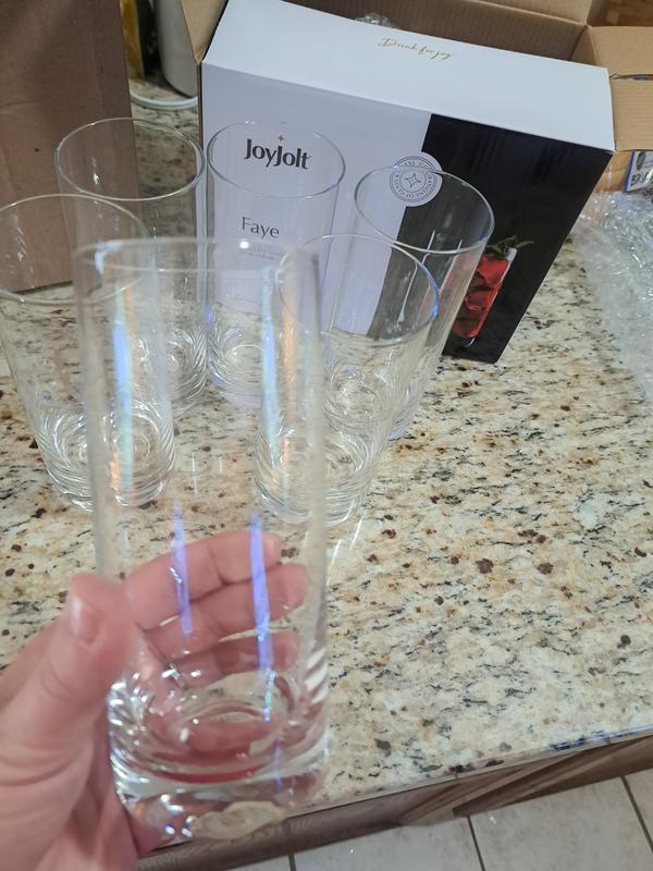 These glasses are absolutely beautiful. They are a simple highball style. Received well packaged in the box. Comes in a set of 6. They hold 13 oz of liquid. The bottoms are thick and say joyjolt in the bottom.
