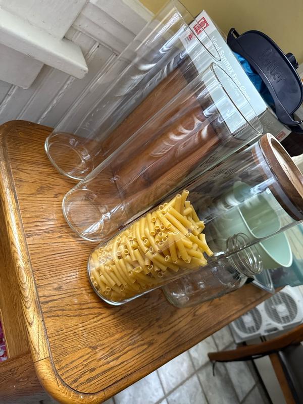 I love these they’re so cute and air tight can fit about two pounds of pasta in them they are glass so goes with any other decor they are a bit thin I was afraid it’ll break washing them