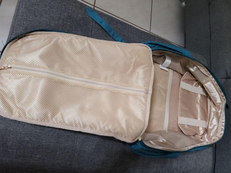 Perfect bag. Plenty of pockets for organising your belongings, so comfortable and lightweight to carry on the back, zippers run through easily. So far nothing was spilled on it but the fabric is supposed to be easy to clean. Love my JuJu and very satisfied with this purchase!
