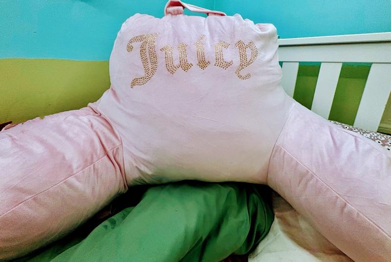 Juicy dreams only,I’m absolutely obsessed with my Juicy Couture Velour Backrest Pillow! The soft black velour feels so luxe, and the rhinestone Juicy logo adds that perfect glam touch, It’s super comfy and supportive, perfect for lounging, reading, or scrolling in style, The 30"x17" size is just right for cozy comfort and a little sparkle in my space.