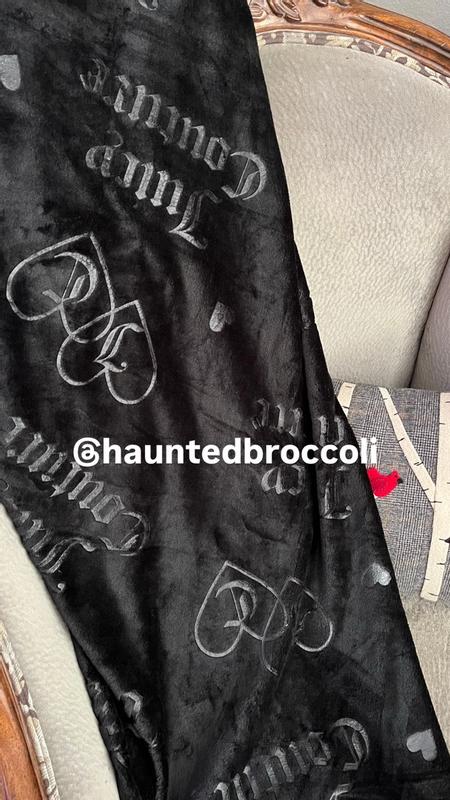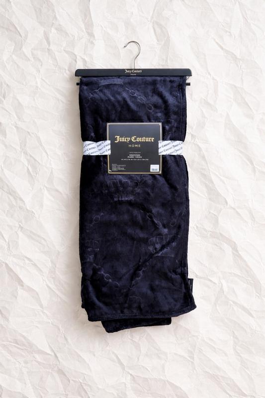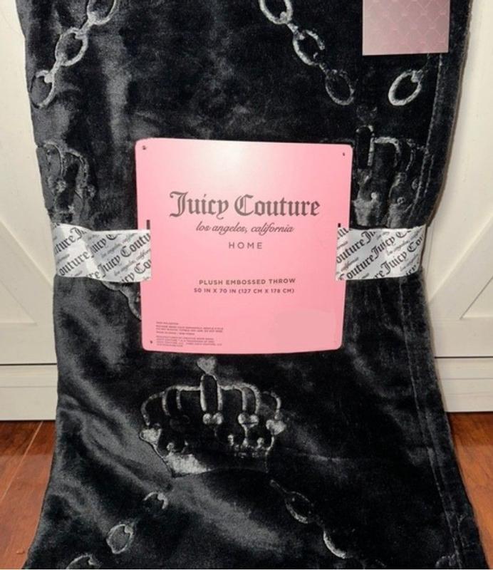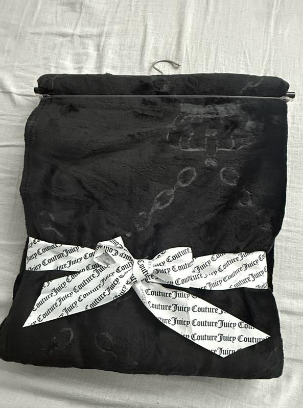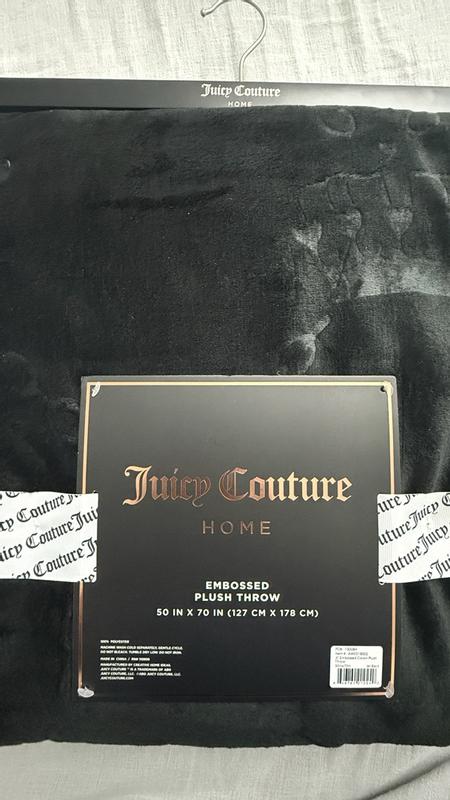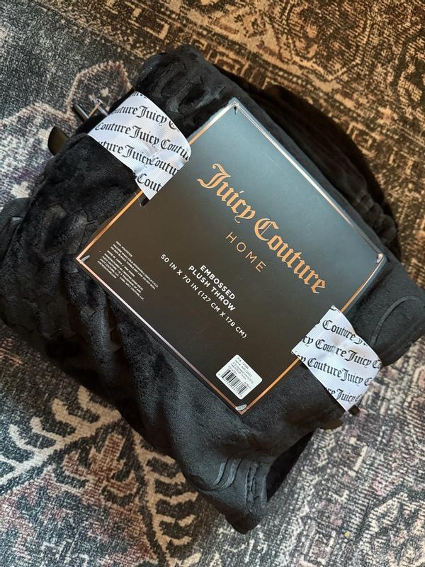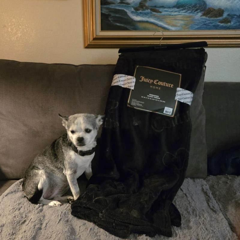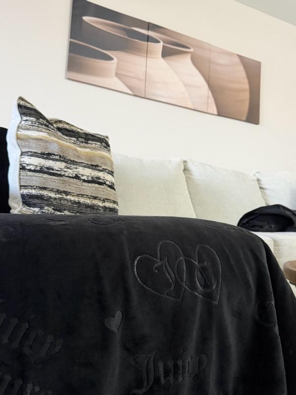 I love this Juicy Couture plush throw blanket! It’s incredibly soft and cozy, and the black color with the embossed interlocking hearts is really cute. It’s warm without feeling heavy, and looks great draped over my couch gray couch. After washing, it’s still just as soft. It's perfect for relaxing nights and definitely feels like a quality throw. My dogs love it, too.