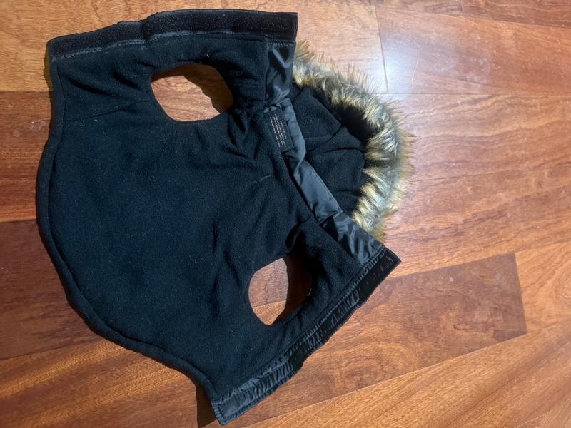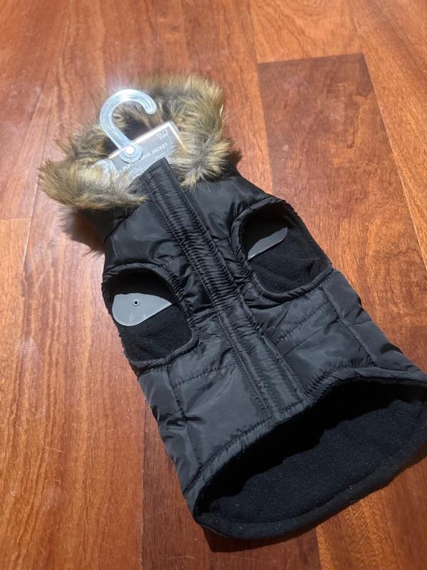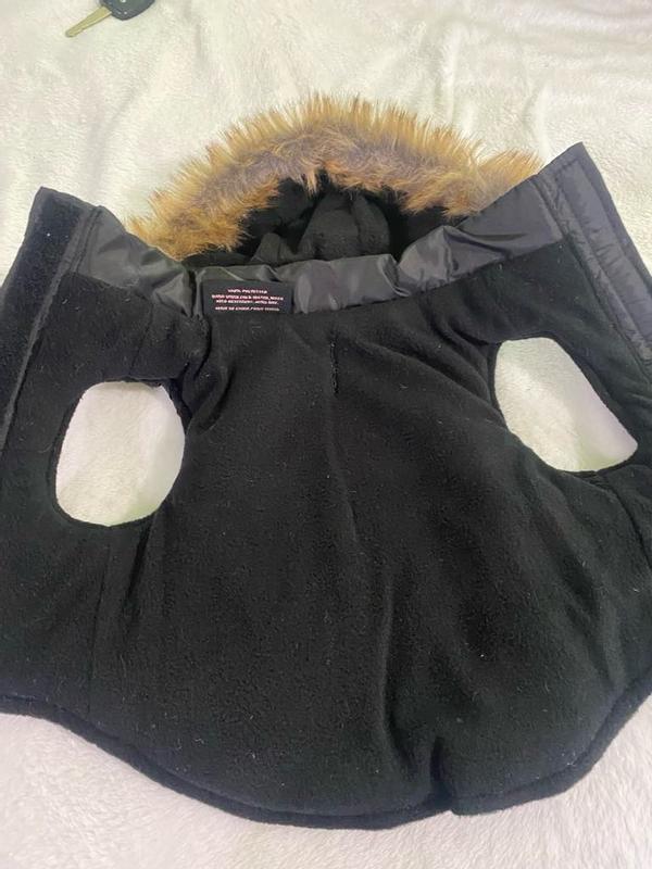 The cutest little jacket! Its lined with fleece so itll be really cozy and i just love the fur hood. This will fit perfect on my God Mothers little Yorkie.