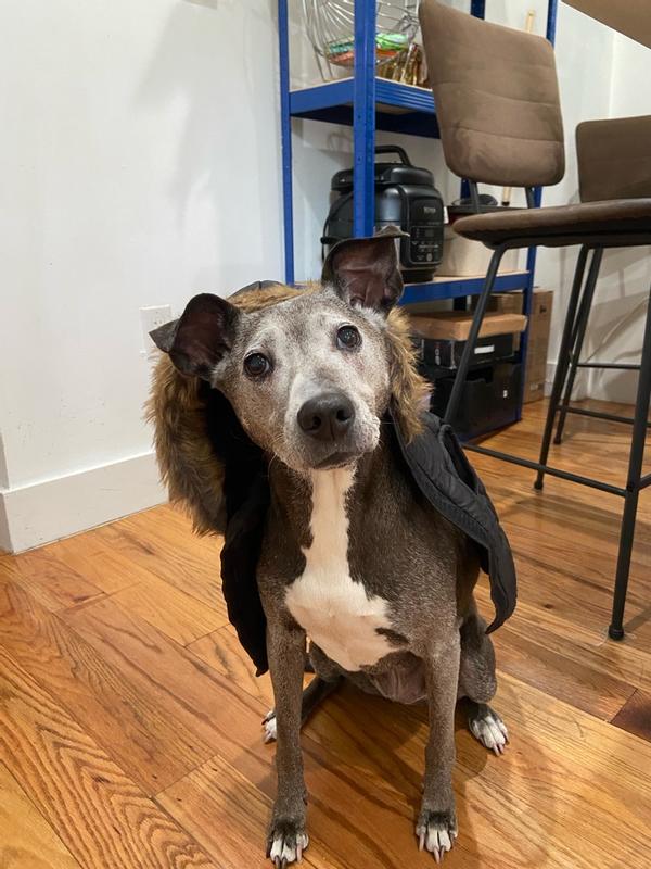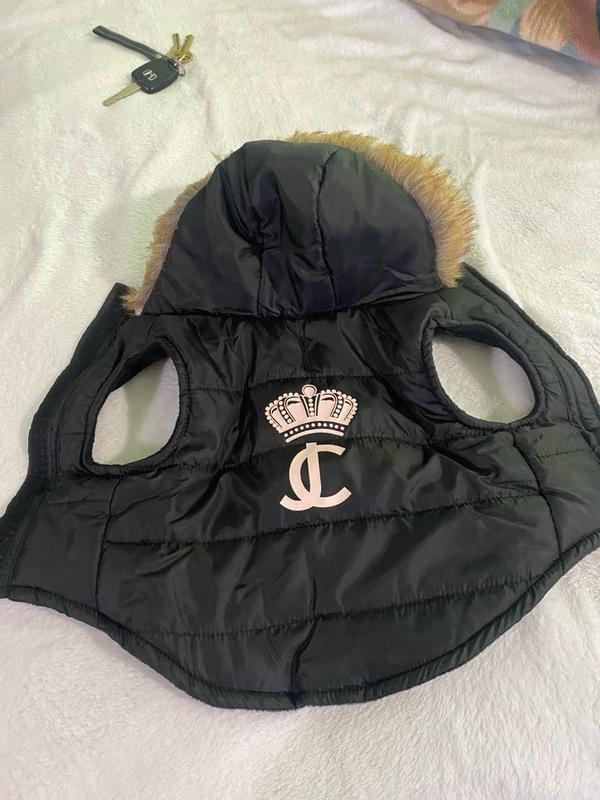 Really cute dog vest with faux-fur hood. Unfortunately, we didn't catch that this one is a large, and our pup is just a small chihuahua terrier mix.