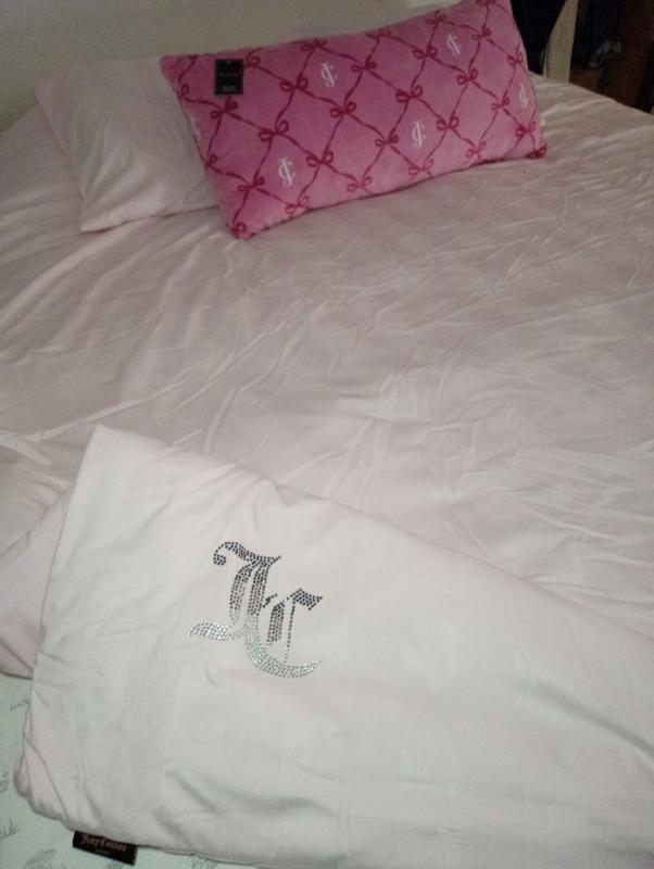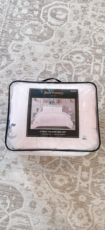 Add a little Sass and Class to your bedtime with this Juicy Couture Home 3 piece Velour Stripped Bed Set in Pink Marshmallow. The soft light pink is just the right amount of pink, not too much, and the stripes give it texture/depth. This comforter sets velour material is both soft and durable. The material feels like it would take a lot to destroy, even the velour is short and tight but super soft to the touch. Matching pillow cases for an all around good look. Holds up in the wash (gentle or low cycle) (The body pillow was not included in the set, that is a separate product)