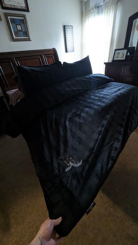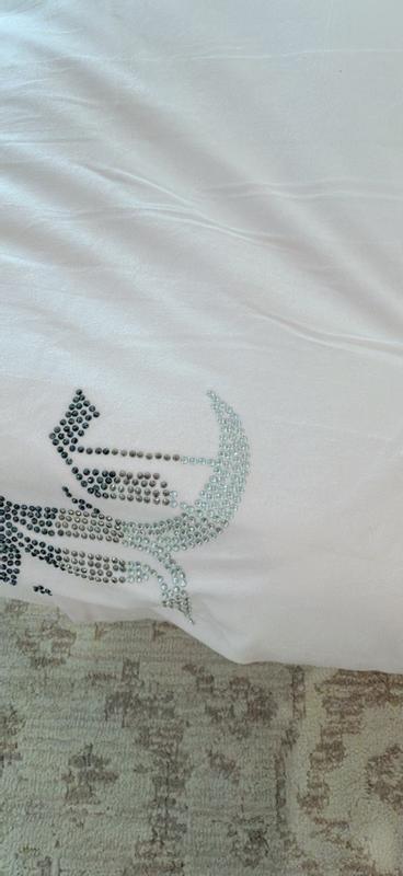 This is such a nice and warm comforter set with the most expensive look and feel to it. The material is very nice and the pattern is very elegant. Well stitched and has a nice weight to it too. Love the bedazzled brand logo detail so much.