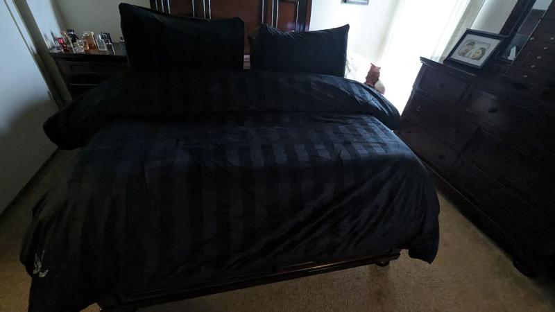 This comforter set is really nice. It is simple yet very elegant. It is more on the thicker side but doesn’t feel heavy. It keeps us nice and warm and with the cold season coming, it makes me not want to get out of bed. The pillow shams are also nice and smooth. It is easy to wash and dry as well. Doesn’t take longer than most comforters to dry and it doesn’t come out looking wrinkly or ugly. Very good material and durable. It is also true to size which is nice.