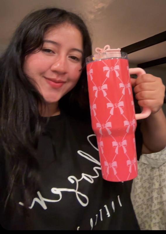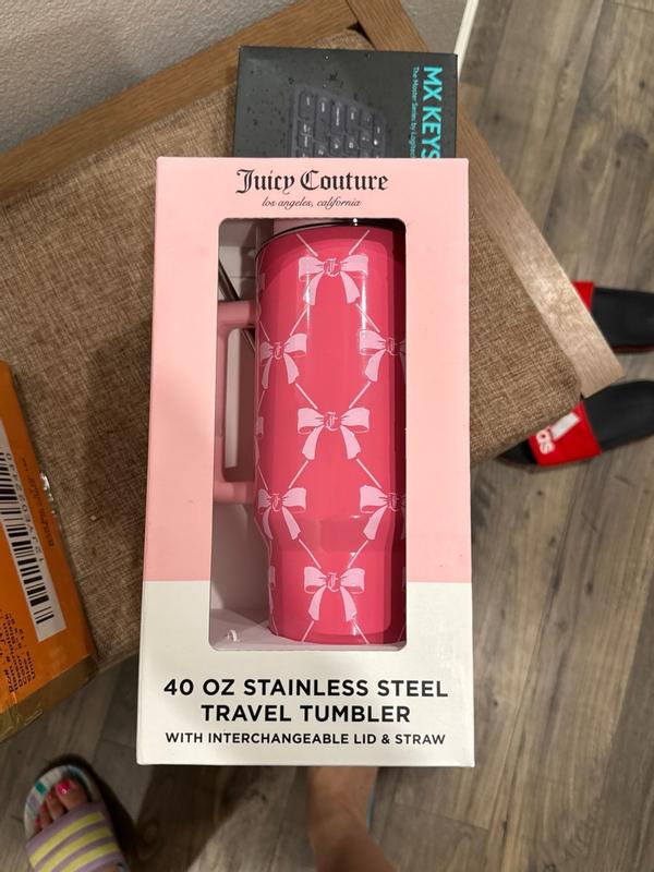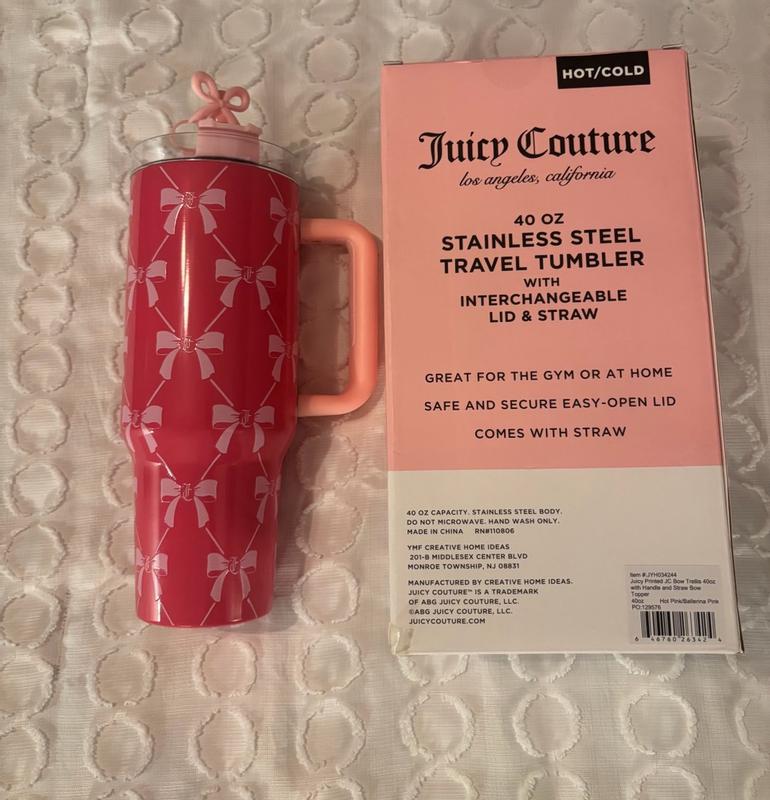 Juicy Couture Jetsetter 40oz Tumbler is so cute! First of all I love the pink and bows around it. It is stainless steel and can handle cold or hot liquids. It has an easy grip handle and cup-holder friendly. My favorite 😍 ♥️