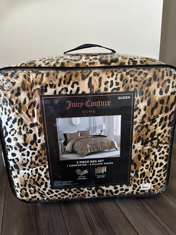 I received this Monica Leopard Satin 3-pc Reversible Comforter Set from Juicy Couture and Influenster in exchange for my honest opinion. The leopard print itself is somewhat shiny in the right light and feels very nice on the skin. The reverse is a flat black microfiber. A nice contrast. I like that the comforter is not a duvet cover as those always end up twisted up on us. Plus the comforter is reversible so if animal print isn't your thing, you can always flip it over and enjoy the satin on your skin. It's not too heavy, not too light and is washing machine friendly. The pillowcases were a bit small for our pillows but in all fairness, we have some fat pillows.