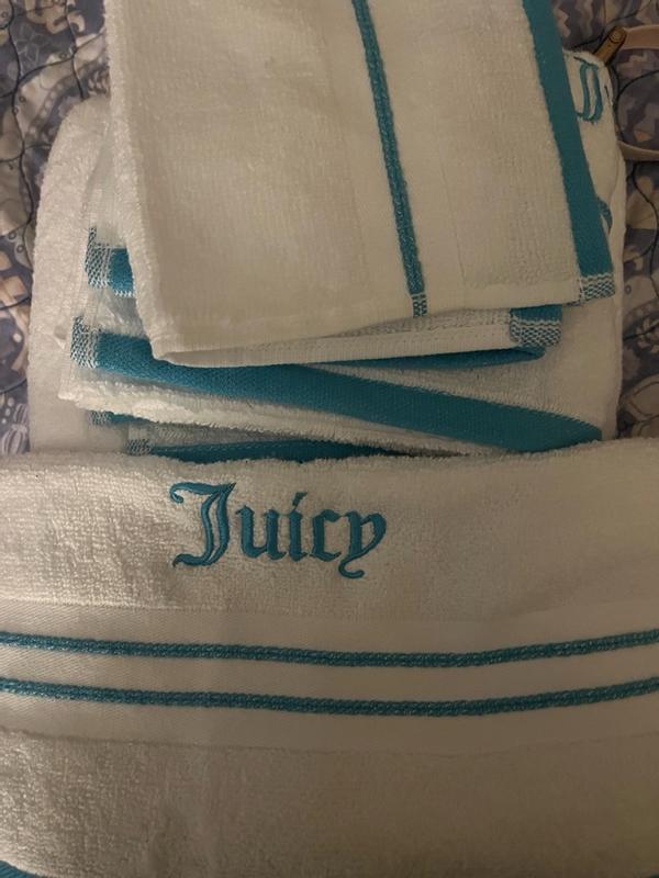 I was so excited to get these towels, but I will be returning them because the pinks don’t match! The “Juicy” writing is a pretty, hot pink and the stripes on the trim are a shocking, neon pink... Like what the heck?! Also, the fabric is much thinner than I was expecting… I’m pretty disappointed in this Juicy Couture product.