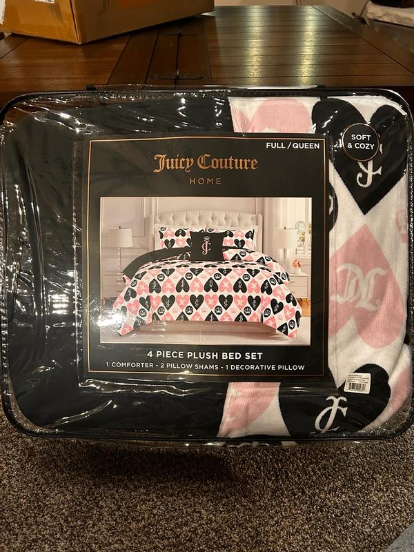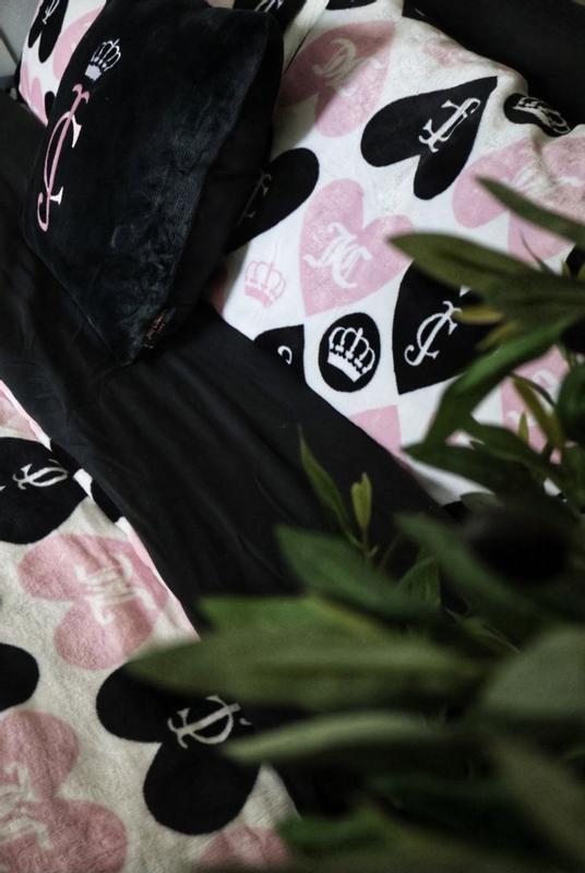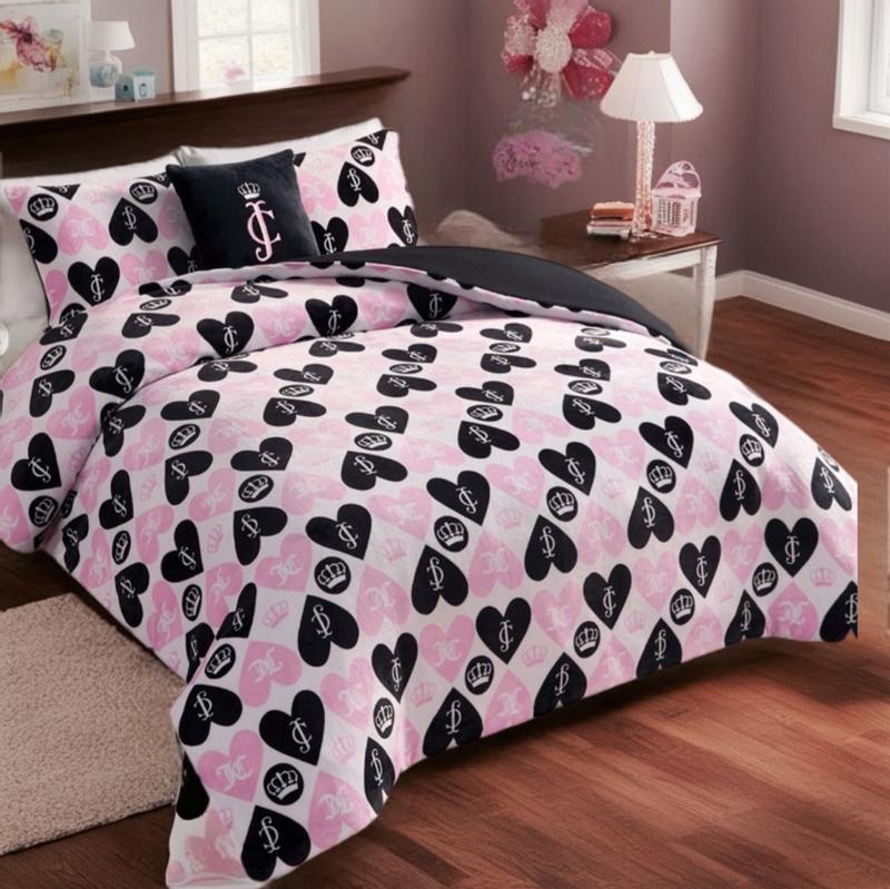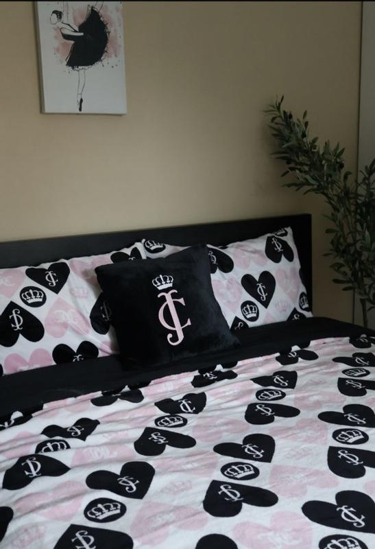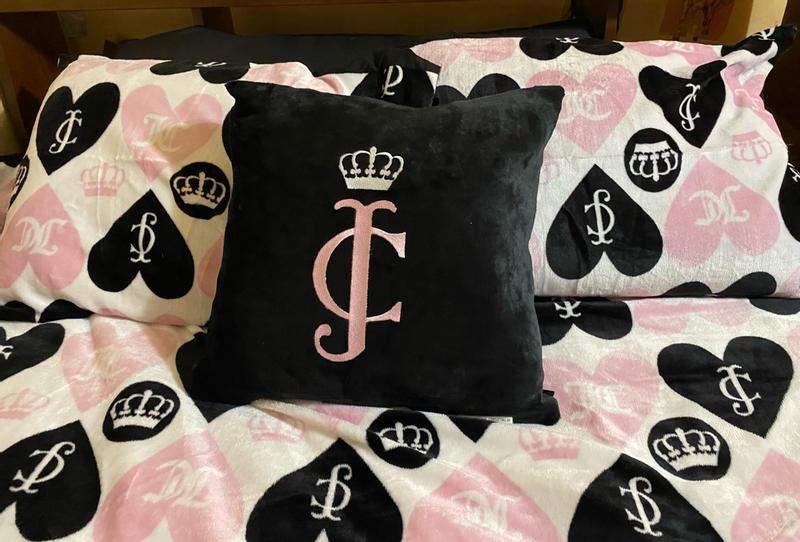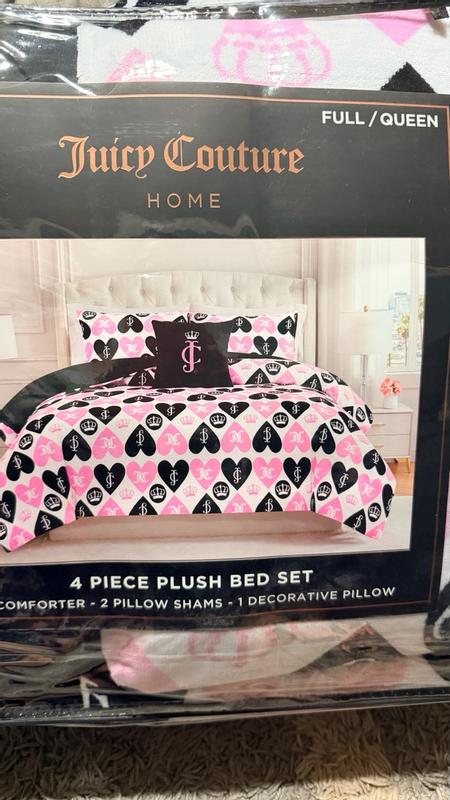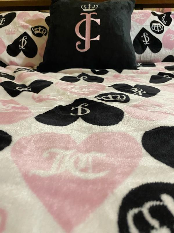 I love this Juicy Couture plush reversible set, the plush heart side of the comforter is so cute. I like the design, the pink and black hearts looks nice against the matching crowns. I love the materials of this comforter set, the plush side is my favorite because of the softness and overall design but I like the idea that I can flip both the comforter and the pillows onto the reversible black side of It If I want something a bit more subtle/simple. The plush decorative pillow is so nice and comfortable to lay with if also adds to the overall aesthetic of the comforter set nicely. This is a very comfortable and high quality comforter, I slept very comfortably while using and I’m very pleased with it!