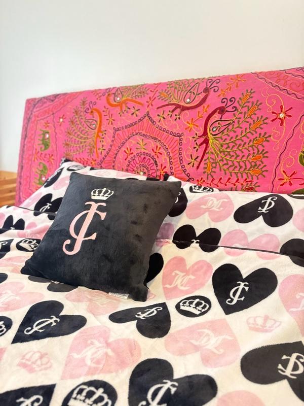 Thanks influenster for this Juicy Couture Plush Reversible Queen Heart Logo 4-Piece Full/Queen Comforter Set with Decorative Pillow Cases ! First I want to say this is INSANELY soft ! Its not too heavy but not too light ! And it fits perfectly as you can see on my younger siblings queen bed ! Definitely recommend !