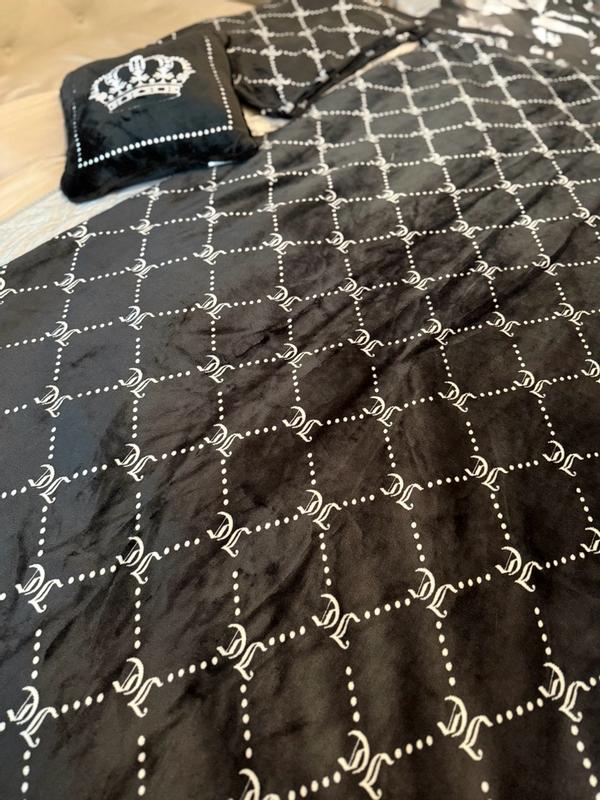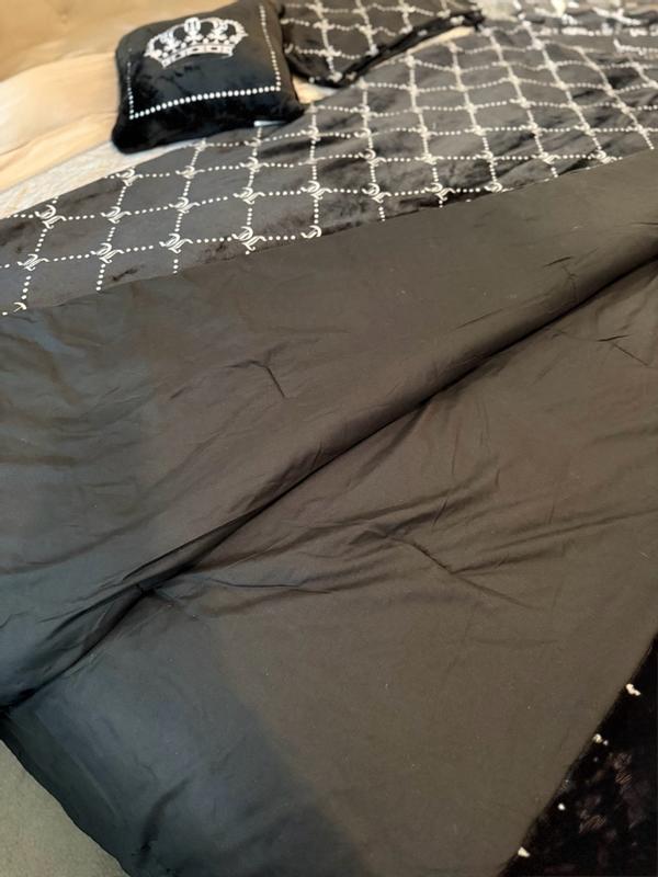 This comforter will give you a good nights sleep. Its a reversible 4 piece plush set thats good for full/queen sized beds. One side has a beautiful trellis design and the other is just plain black. Both sides are extremely soft and the pillows are also the same design. It comes with a medium sized decorative pillow that is so comfortable to lay on. This comforter set is perfect for winter time.