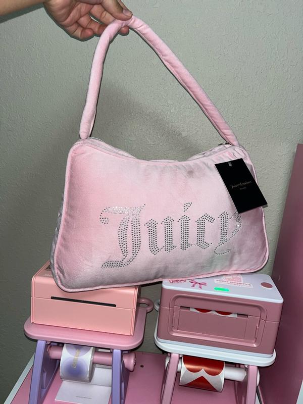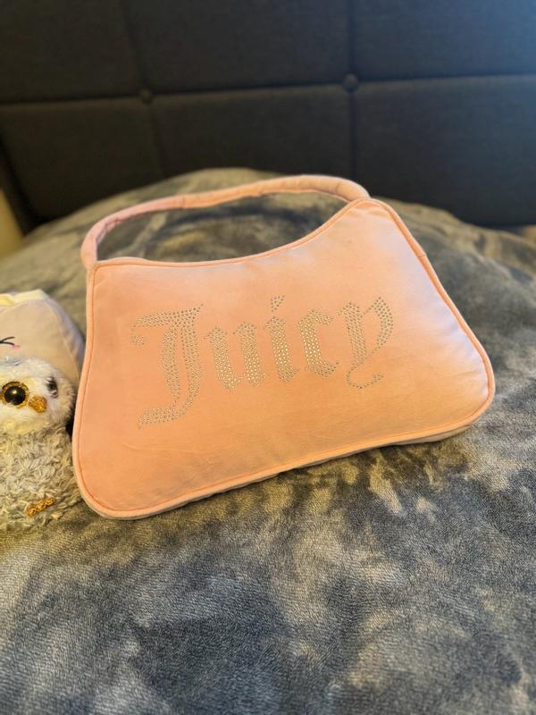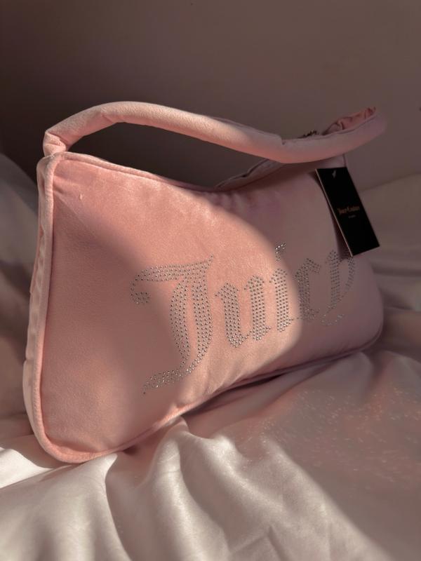 Cute Juicy shoulder bag with sparkly rhinestone logo. Soft, lightweight, and trendy great for casual outfits and carrying essentials. Not very structured and can show wear easily. Overall, a fun fashion piece