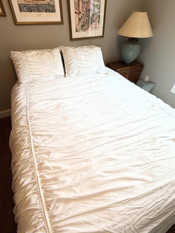 This Juicy Couture Full/Queen Comforter Set is great quality! It looks just like the photo on the bag, is a pretty white color, and is the perfect amount of fluffiness for all year round! The only drawback is the ruched ribbon at the bottom can look weird if it’s not lying right.