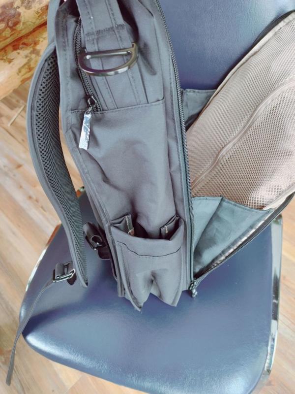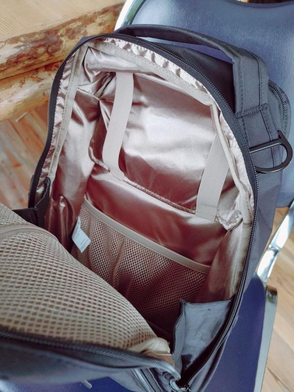 Perfect bag. Plenty of pockets for organising your belongings, so comfortable and lightweight to carry on the back, zippers run through easily. So far nothing was spilled on it but the fabric is supposed to be easy to clean. Love my JuJu and very satisfied with this purchase!