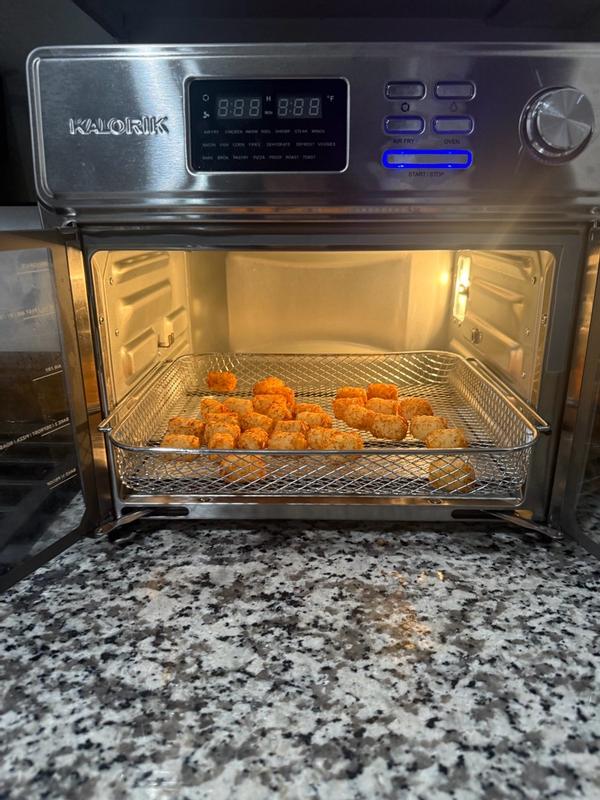 Discover the new generation of air fryer ovens. The Kalorik 26 Quart Digital Maxx Air Fryer Oven combines 10 appliances into one. It functions as an air fryer, roaster, broiler, rotisserie, dehydrator, oven, toaster, pizza oven, and slow cooker. The Kalorik Digital Maxx Air Fryer Oven uses special Turbo Maxx technology to cook food faster than ever. Upper and lower heating elements provide even heat distribution for perfectly-cooked results. An optimized airflow system and high-performance turbo fan are engineered for maximum circulation, delivering the same crispy texture and rich flavor of deep fried food, ¿with little to no oil. This reduces fat and calories for healthier meals. The unique rotisserie setting rotates the included spit accessory during cooking, allowing meat to roast evenly in its own juices and develop maximum flavor. The Kalorik Digital Maxx Air Fryer Oven reaches up to 500°F, perfect for searing meat or vegetables to caramelized perfection. The oven can fit a large chicken, 12" pizza, or up to 9 slices of toast in its cavity. Modern and multi-functiona, the Kalorik Digital Maxx Air Fryer Oven features glass French doors with single-hand opening to prevent dripping or scalding. A built-in auto-shutoff safety feature automatically stops operation when doors are open. An easy-to-use digital LED display contains 21 presets for foolproof cooking. Accessories include an air frying basket, baking pan, air rack, crumb tray, bacon tray, steak tray, rotisserie spit