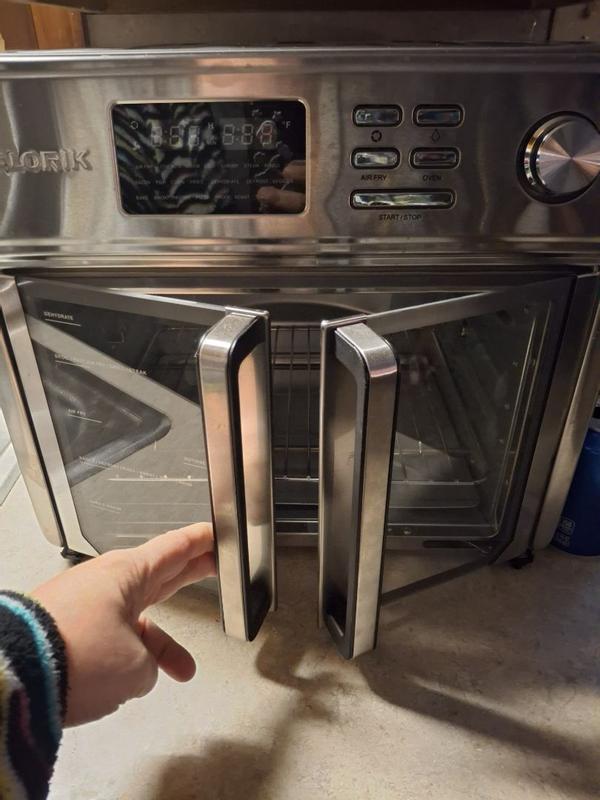 Overall this is a great air fryer. I gave four stars because some things could be better, like the doors and the crumb tray. I like that the doors are French door Style, and that they open up the same time, but when closing they will slam shut if you're not holding on to them. The crumb tray is about a quarter of an inch too short, so as you can see in the video when you're pulling things out of the oven some of the crumbs fall underneath the tray against the door. I like that it cools off itself after cooking and that it doesn't get too hot on the outside. It's much quieter than my last airfryer and I like all the functions that it has for cooking. It will cook a whole frozen pizza and bake rolls perfectly, and the rotisserie function works very well too.