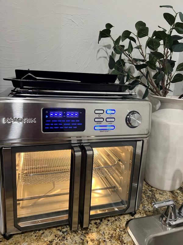 The Kalorik 26 QT air fryer oven is perfect for my family of 5. The air fryer gets food crispy fast and I love that it has so many different features and accessories. We can bake, broil, etc. It has preset temps for cooking all sorts of foods and even came with a recipe dish. The French doors provide easy access to all the trays and cleaning it is a breeze!