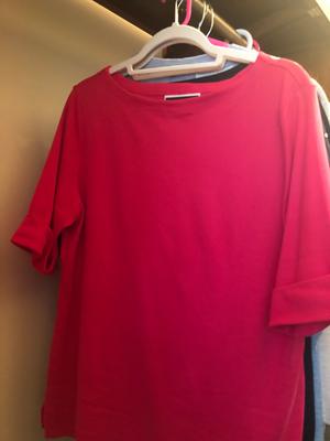 This top fits so well. I like the sleeve length and I can easily dress up or down. I have it in almost all the colors, and wear all the time. It's 100% cotton (thanks , Macy's), and thick. The boat neck is really stylish. Can't recommend enough !