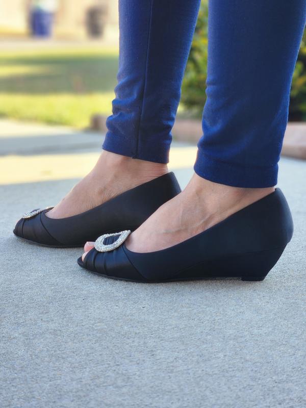 These shoes are very nice. They are comfortable and very attractive. The heel size and wedge was just what I wanted.