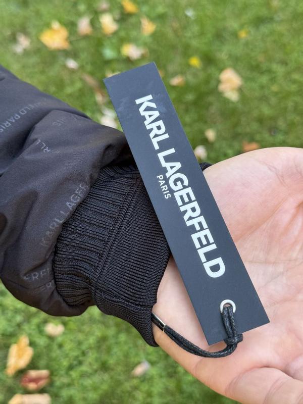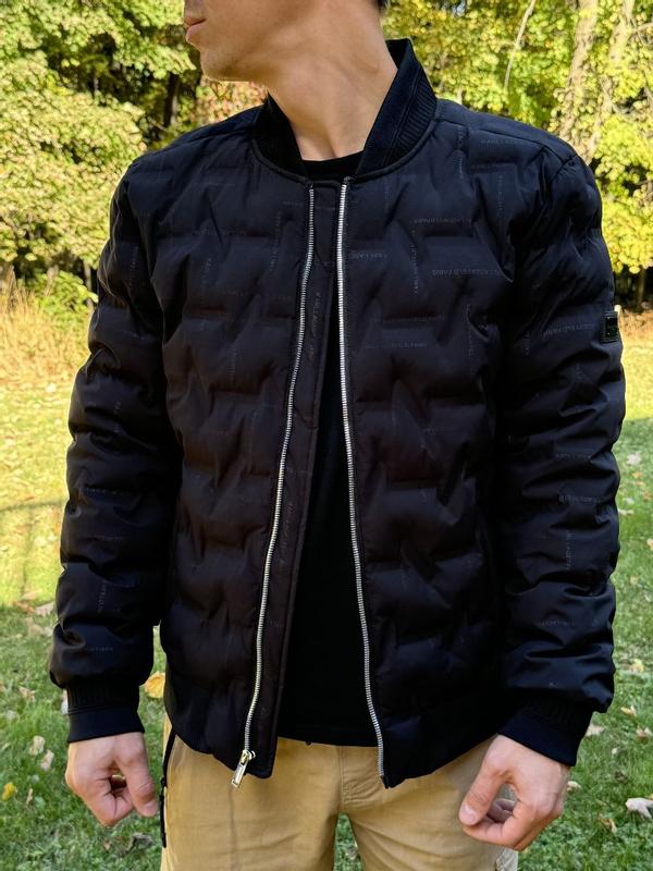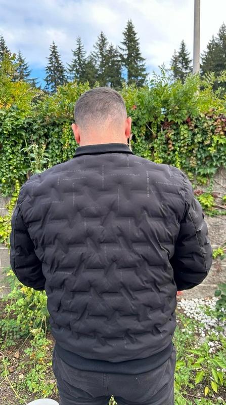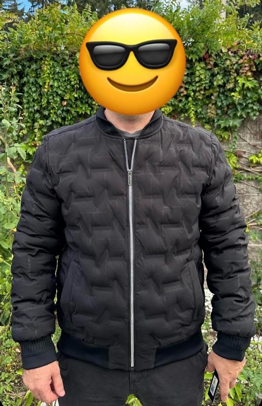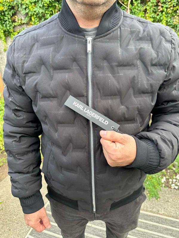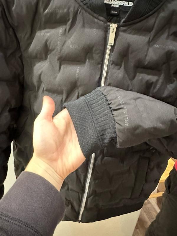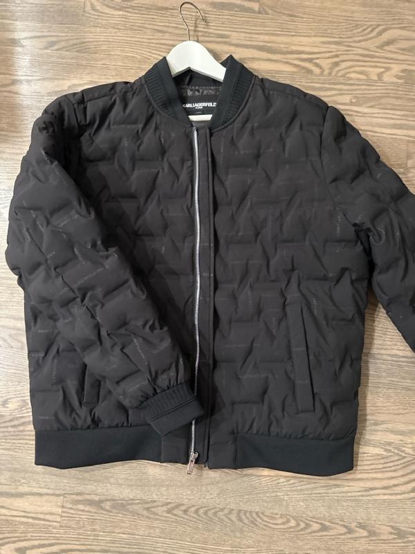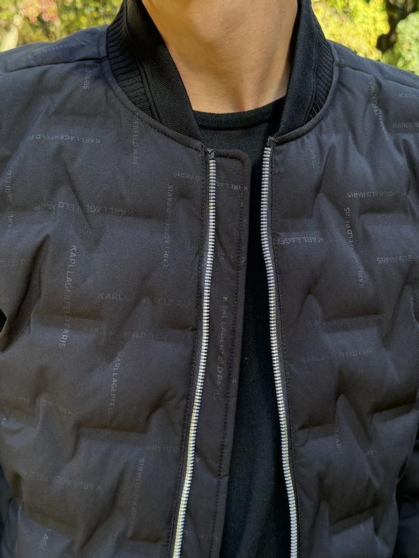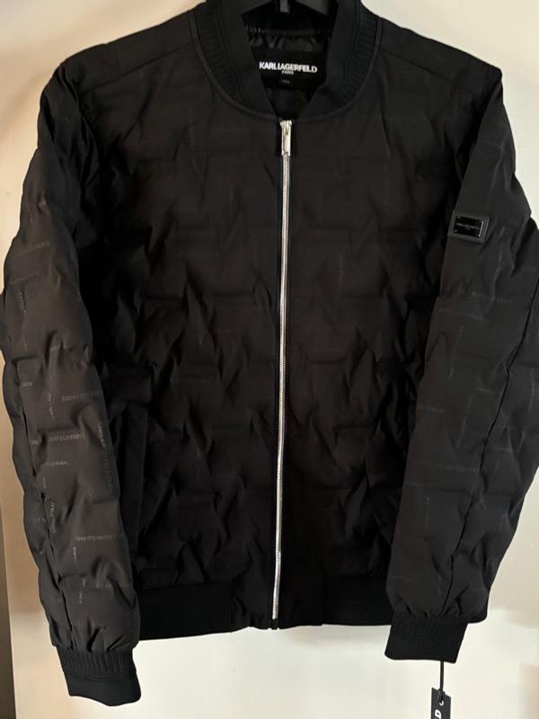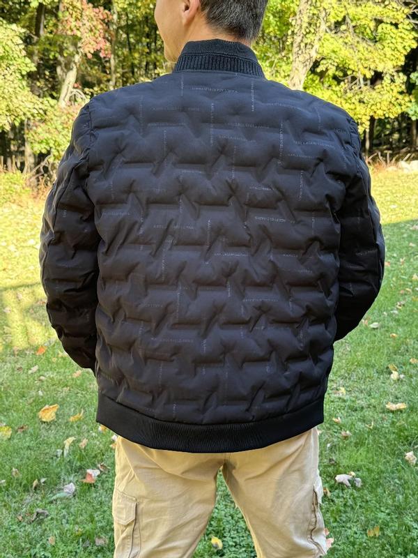 Nice modern twist to the classic bomber jacket. I’m 200lbs and 5’7 and the large fit great. Not much room to layer underneath and can be a bit tight in the arms. Love the quilted look and the comfort is unparalleled. It adds a unique flair to stand out from the usual bomber look. Thought the all over karl branding would bother me but it’s not very noticeable.