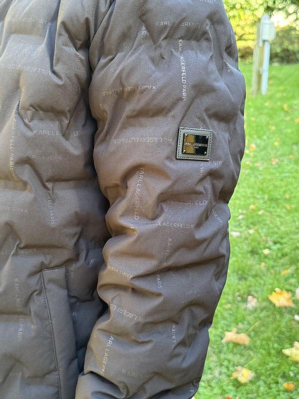 I’m 5’5 125lb Female bought a small and it fits perfect. Karl’s logo is printed throughout the material. Bought jacket on a 1 day sale and very pleased with investment. Thank you Macys!
