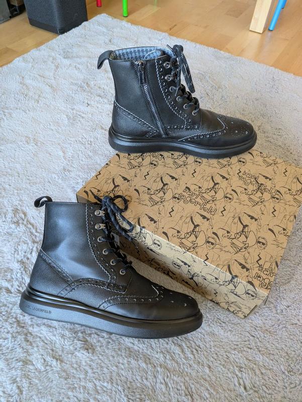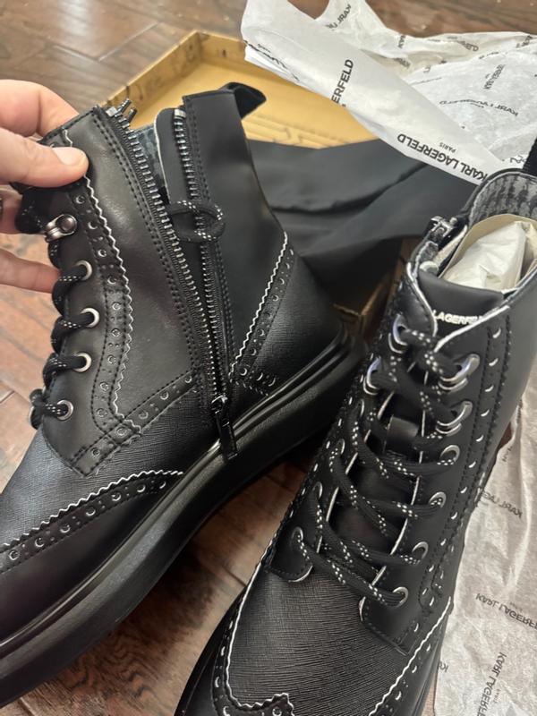 boots from KARL LAGERFELD PARIS. These wingtip boots have a sleek and modern design, made from smooth and saffiano leather. They come equipped with a practical side zip and a sturdy rubber sole, ensuring not just style but also maximum comfort and durability.