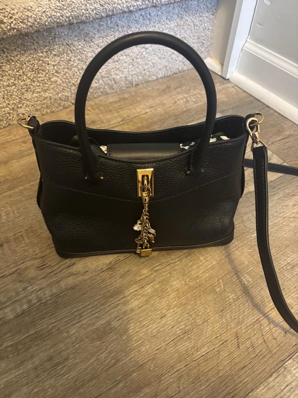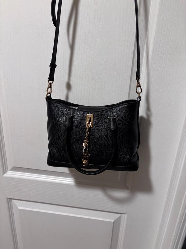 Omg this bag is just so cute and adorable. It’s small. Like big enough for wallet keys and phone small but I love it either way. I have been able to stick my kindle in it as well as it fits but it’s snug. The leather is just beautiful and I love the charms on it. It’s girly but not overly girly. It’s easy to hold by the handle and the crossbody strap Is comfy too. The closure is cute and it works. There are also pockets for small things like change or chapstick .