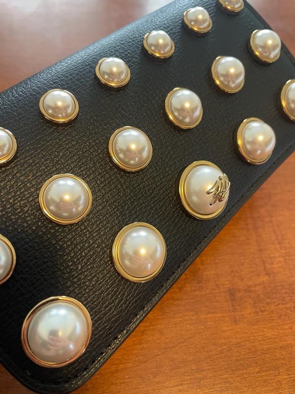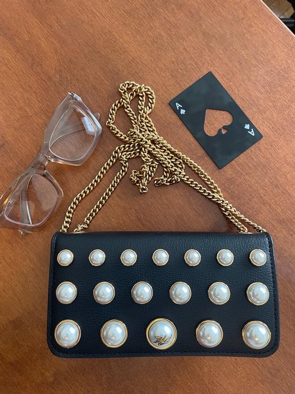 Super cute fun style, love the combo of pearls and leather, and feels very Karl Lagerfeld to me! Nice size for going out and fits my essentials. The chain handle makes it just a bit heavy but that’s my only qualm.