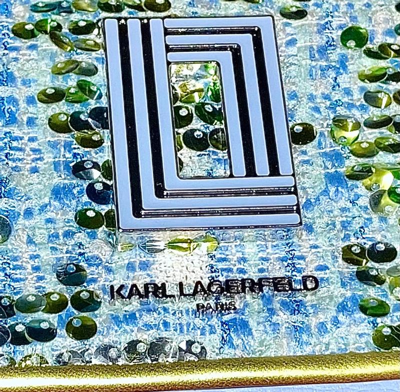 Beautiful and unique Karl Lagerfeld evening bag! The style is both retro and whimsical! Perfect for a party, concert, cirque or any special event night! Quality craftsmanship. Blue leather with fabric adorned with blue and green sequins. Silver chain strap and hardware. The strap can slide to be doubled or adjusted as a longer single strap. Magnetic closure. One outer pocket and three inner pockets. Plenty of room to fit a phone, compact, lipstick, ID cards and more. This purse will last for many years to come! Love it!