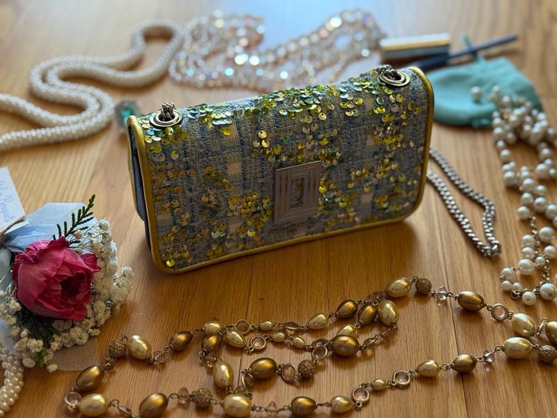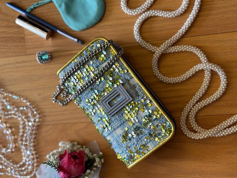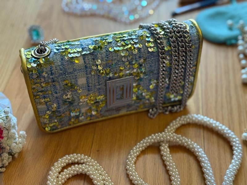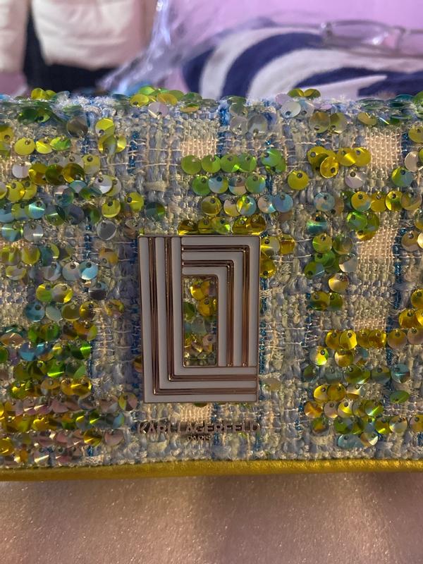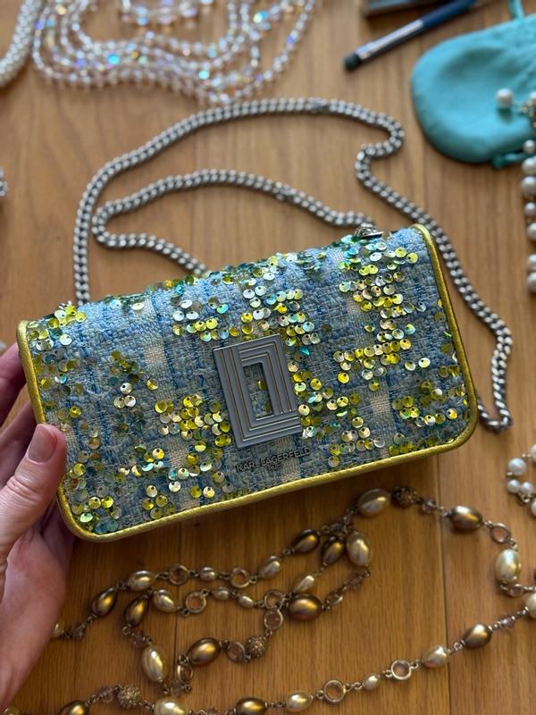 this bag became the lovliest sparkle of my day. Love my Karl Lagerfeld Paris Tweed purse (Wallet-on-Chain style) This little wallet-on-chain is such a gem. The tweed with sequins and the lemon-lime with sky-blue colors looks so fresh and trendy, it instantly lights up any outfit. The size is perfect — my iPhone Pro Max fits easily, even two of them, with space left for a lipstick and a card. The chain feels nicely weighted, very good quality, and the pockets are well designed. It’s a beautiful, practical accessory that feels fun, chic, and really well made.