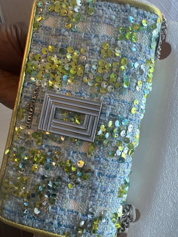 This purse is the best. It fits my iPhone 16 max, bank cards , and lip stick. very sparkly and shiny , I can wear it together with any outfit , looks ver impressive. Love it.