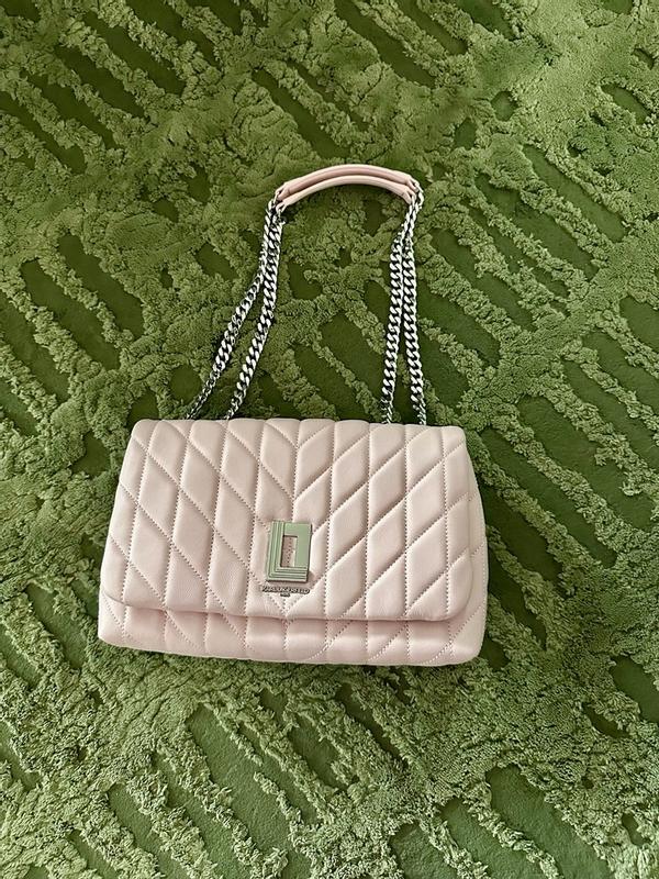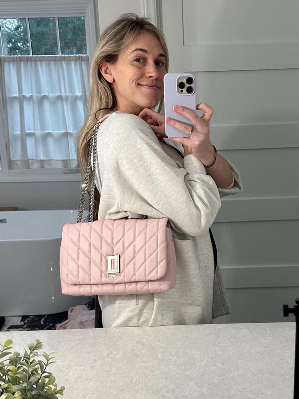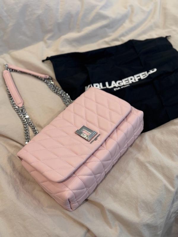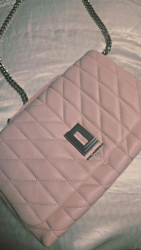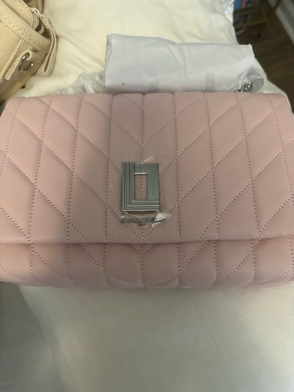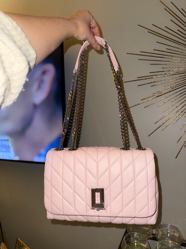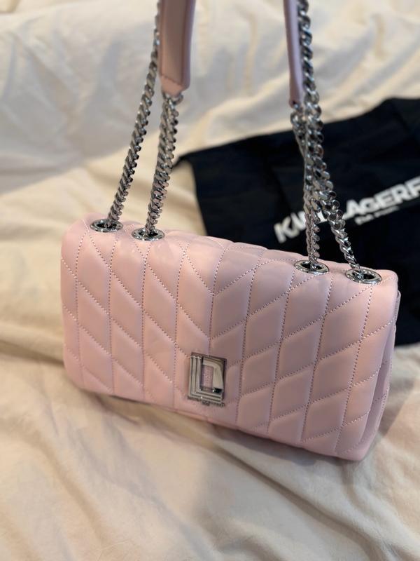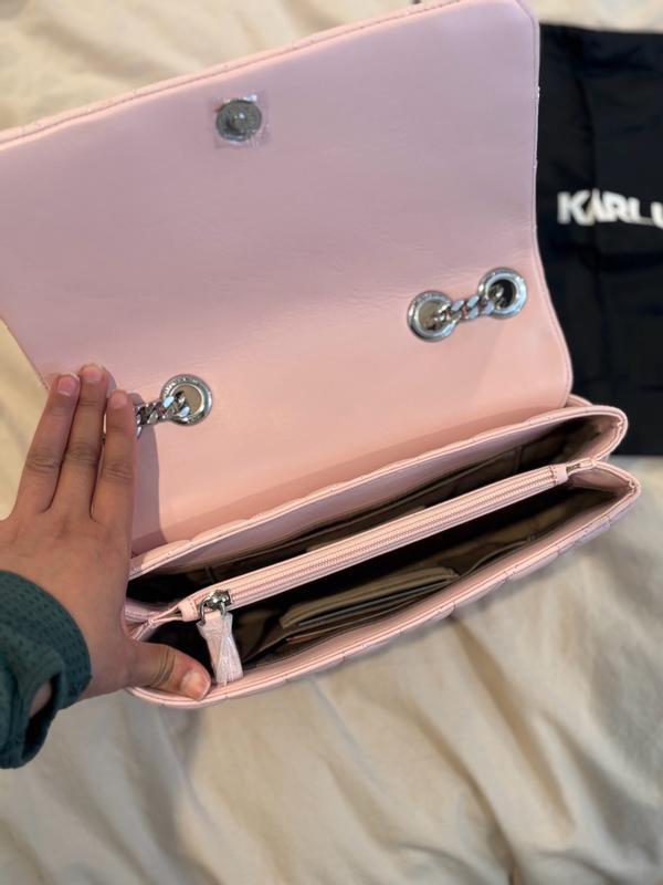 OBSESSED with this statement pink bag! The light pink and stitching pattern is adorable, and the chain on the straps and logo are quality. Lots of space inside the bags for all of my things, while still being a smaller purse. Easy magnetic closure for the front flap. KL knocked it out of the park with this bag!