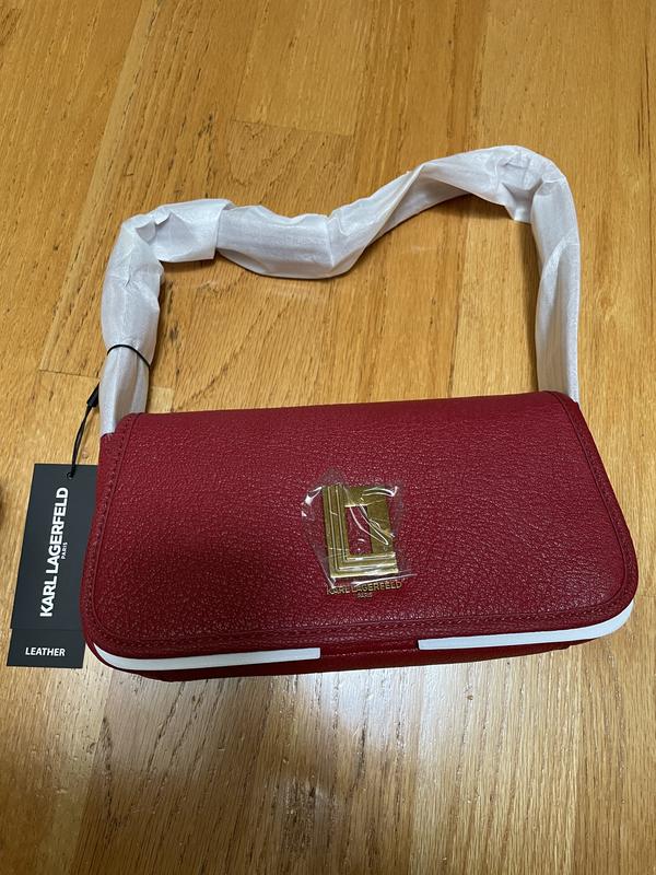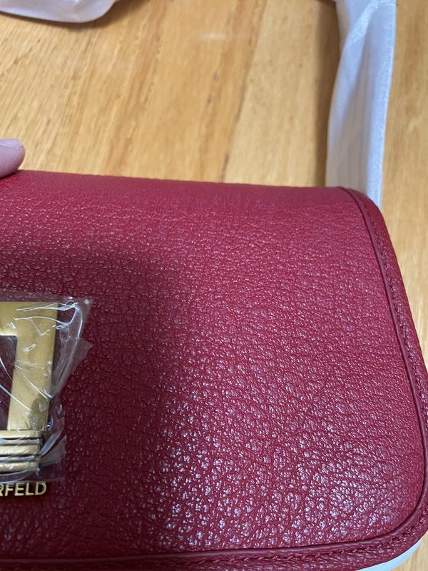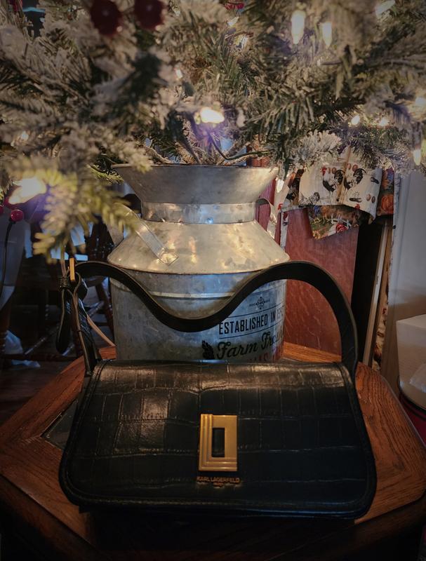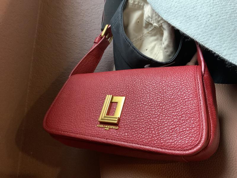 This is a beautiful purse that I would use on weekends for lunches going out, but I wouldn't use it as an everyday purse. I love the gold hardware on the front. This is an all leather purse and it comes with an adjustable strap so you don't have to carry it just as a shoulder bag. It is a great high quality made purse from Karl Lagerfeld. The leather on the purse is very soft and it has a back pocket. Even though this is a petite purse you can fit quite a lot of things inside.