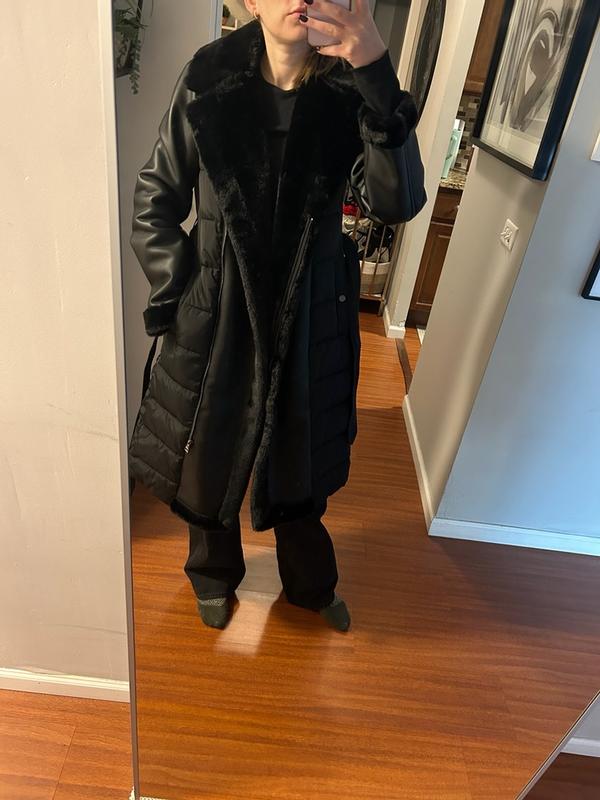 The quality of this coat is amazing. There is definitely a good weight to it so it will definitely keep you warm in the winter. I’m 5’1 and feel this isn’t too long to wear. The style allows you to dress it up. The details on this coat are stunning. The sleeves have a leather-like feel but the body is more of a durable puffer coat. The neckline is rimmed with the softest faux fur, this detail I absolutely love. The coat is very stylish but still functional! Love it!