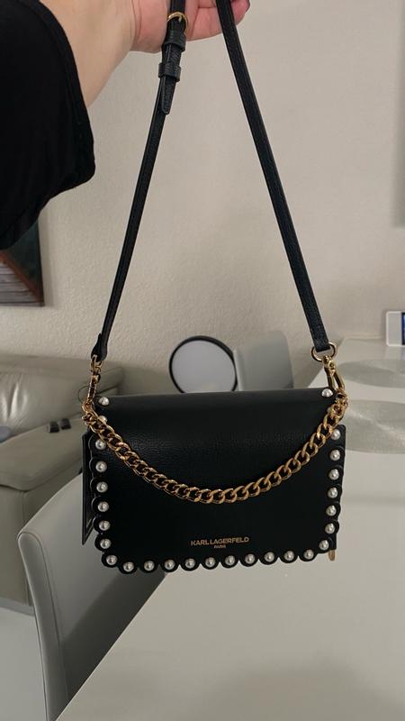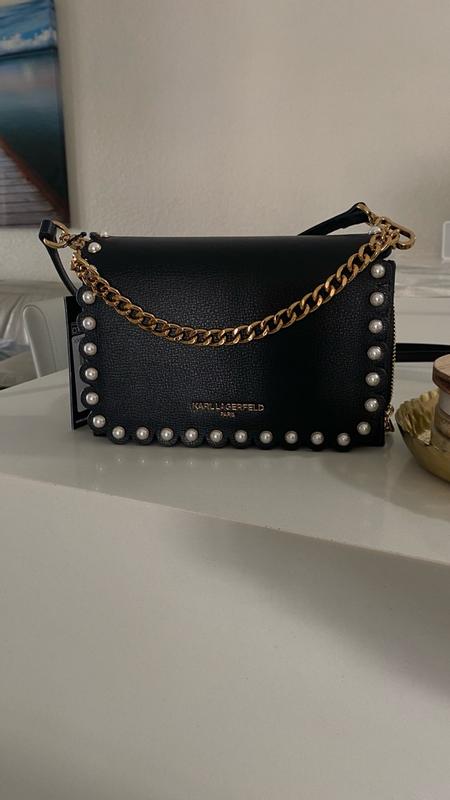 This Karl Lagerfeld purse is just the right size for a night out or a busy day. It has a long adjustable strap so you get the right fit. It has three compartments inside, one zippered compartment. Roomy enough for your phone and other important items. There is a beautiful scalloped edge around the front flap, with sophisticated pearls. There is also an edgy gold chain detail. It has pebbled leather giving it great texture. This is the perfect purse for any occasion!
