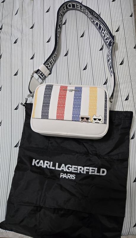 Full of character and pops of color, this camera crossbody by KARL LAGERFELD PARIS features monogram cabana stripes and enamel pins for a truly iconic finish.