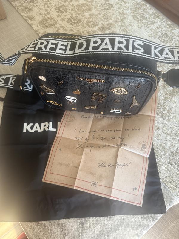 Stylish quilted leather with playful Karl Lagerfeld embellishments. Perfect size for essentials, lightweight, and elevates any outfit effortlessly.
