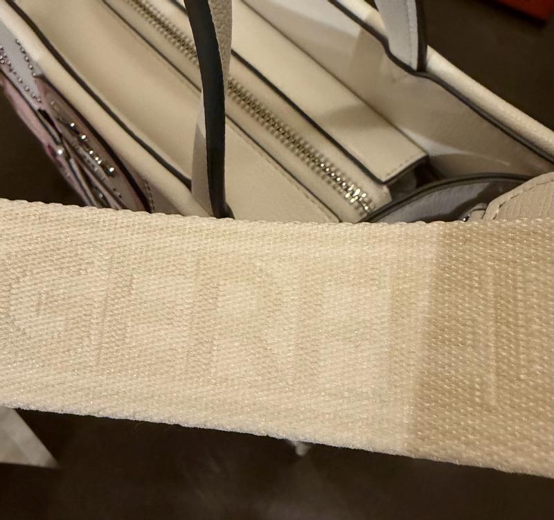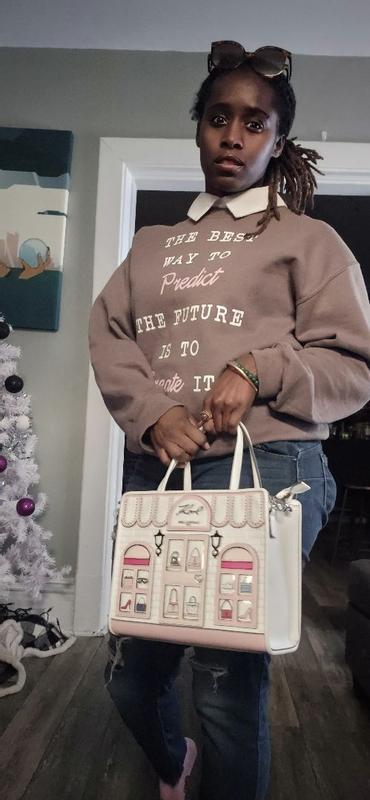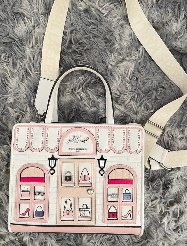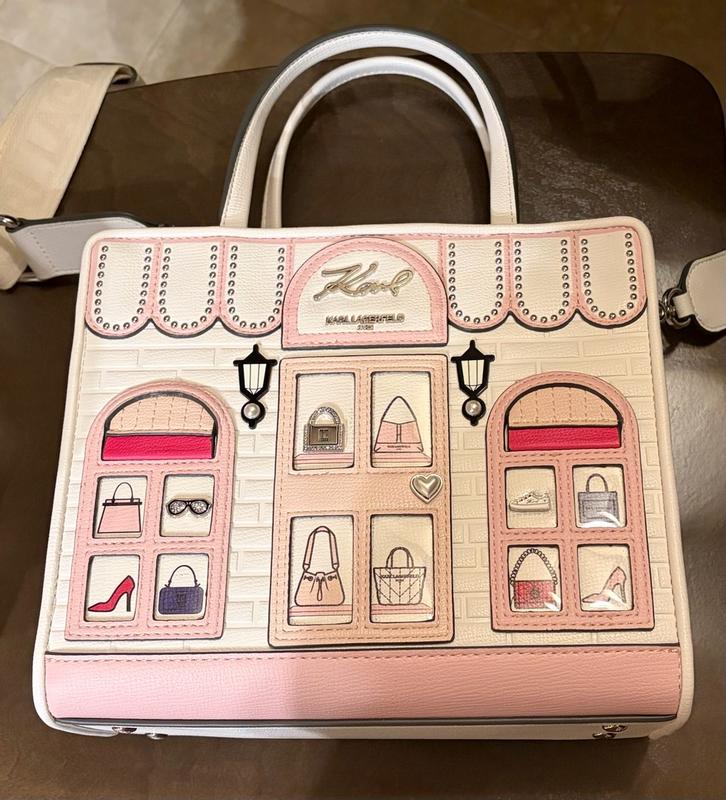 This handbag is so unique and so beautiful. Perfect for a fashionable girl or just a woman who enjoys accessories. The charm like designs of the bag are like no other. Filled with shoes, handbags, and sunglasses. Purse can be worn with or without crossbody strap. The removable strap features designers name. The lining is a neutral color. Purse is small but fits everything I need. Big enough for a wallet, phone, charger, makeup, etc. There is a center zipper, inside pocket, and one outside pocket for easy access. The pink and off white colors are stunning. I really like this bag. Very impressive.