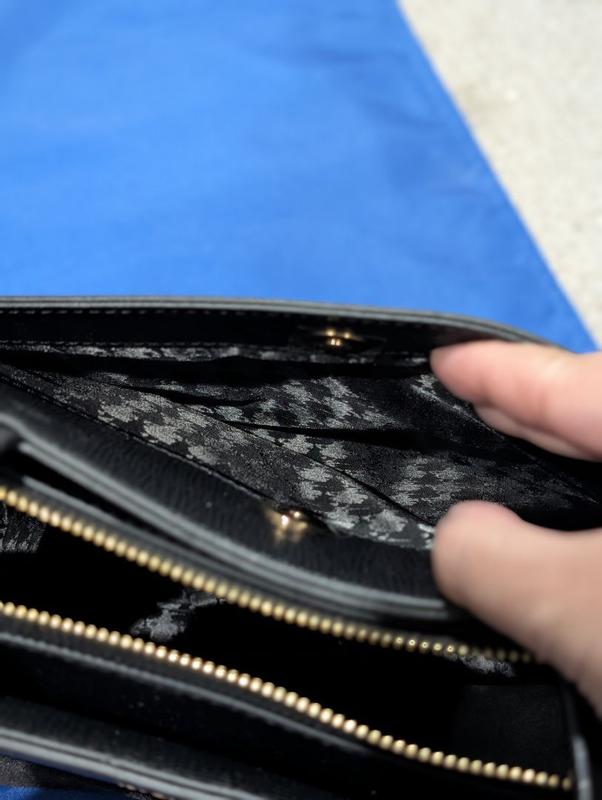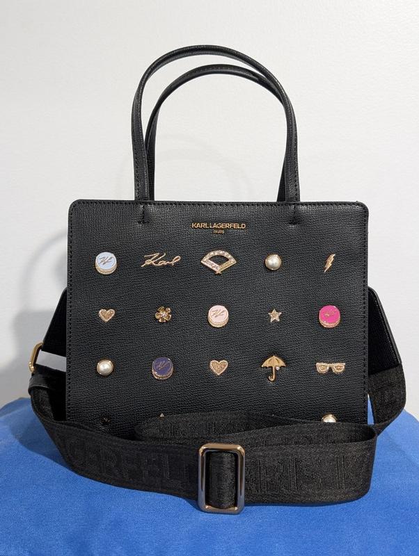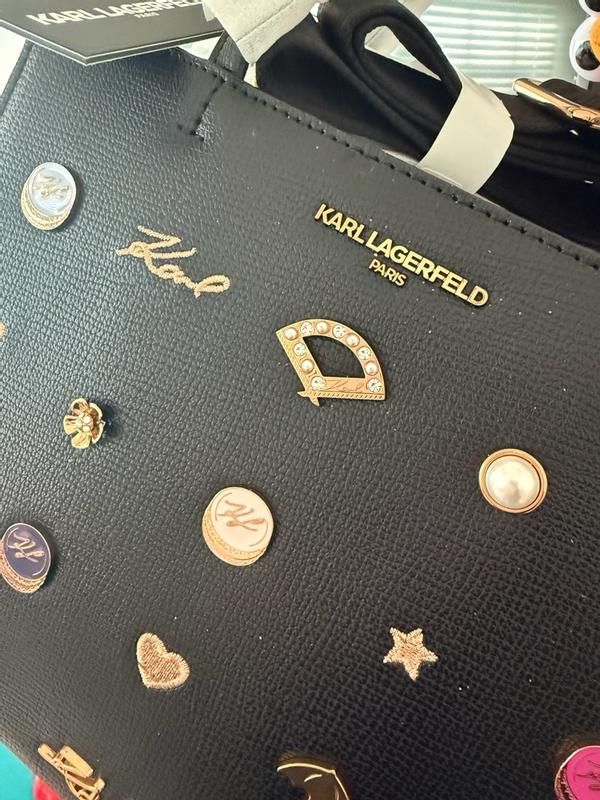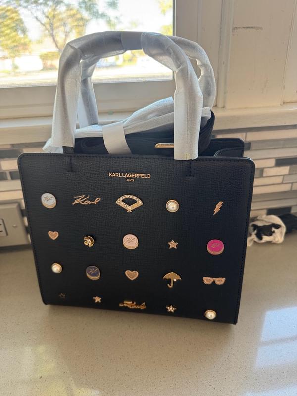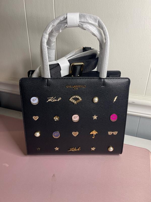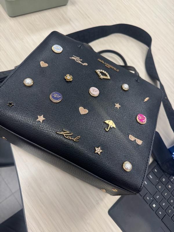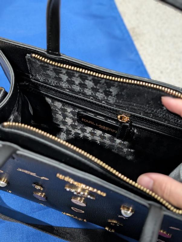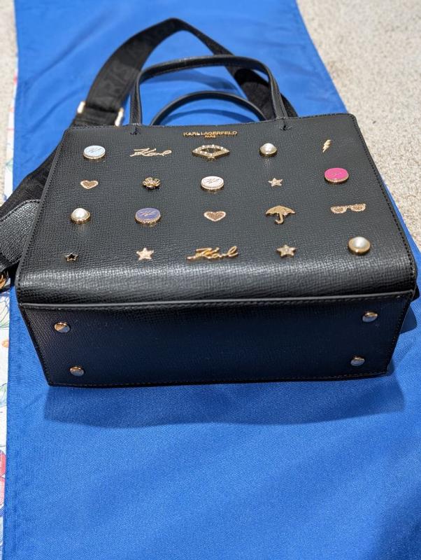 The bag has beautiful, embellishments, umbrellas, sunglasses, pearls, hearts, and stars. It feels like the perfect bag to have out you can take with you on a evening event or dinner, but it also has a nice shoulder strap that you could wear during the day and then remove the clasps and have a more evening purse. It is a nice leather textured material. It feels expensive. It feels extremely durable and would last a very long time. I would compare this to a upper class coach bag or similar. I absolutely love the Karl Lagerfeld logos on the front. It does not have any other logos besides the inside of the bag, it also has two zippers inside. This will be a great purse from anybody around the age of 15 and up super cute. It doesn’t feel very heavy. It is lightweight.