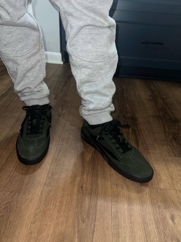 Stylish and comfortable sneakers. They are a dark forest green in a psuedo-suede texture that appears black in the darkness of a club, and a warm green in sunlight. Great with a green sweater or quarterzip.